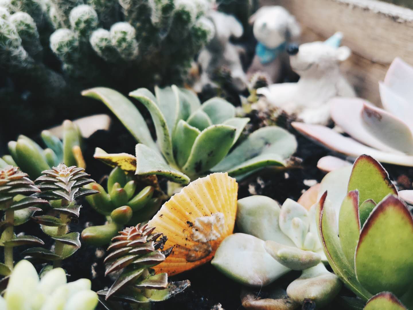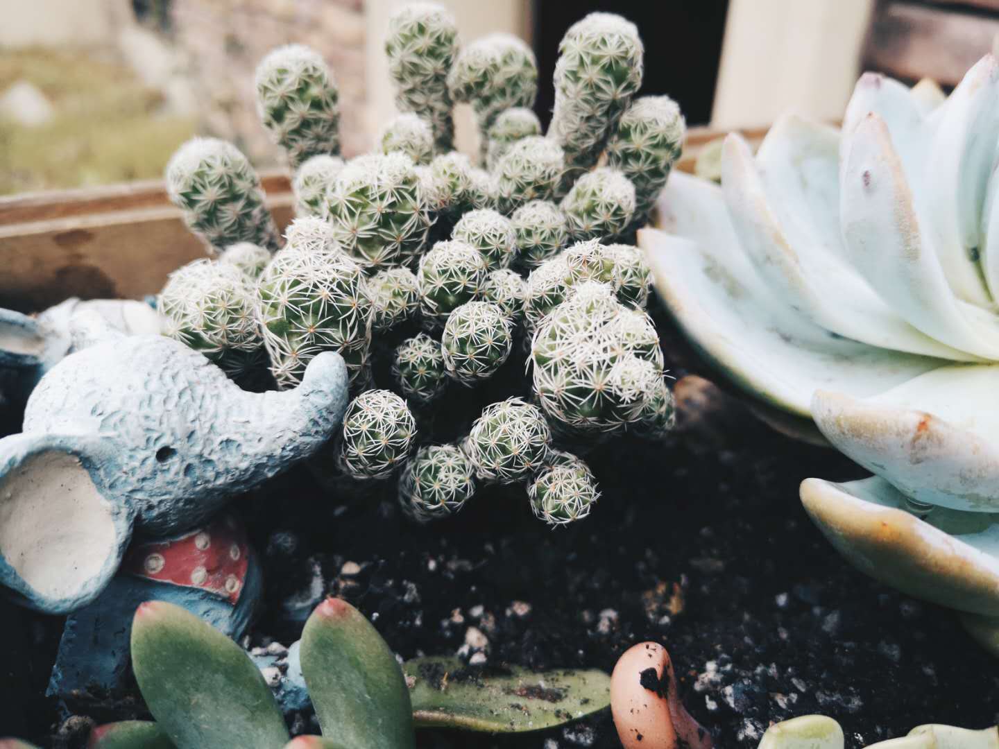 邻家院子里的多肉种得很好,不过看得出来是外面买回来不久的。见他家随意扔在背阴面的院墙上,也担心撑不了多少。还有一次去港区当评委,见到大神级的多肉高手将办公室的角角落落填得满满当当,心里虽然羡慕但也知道在此花费的精力也是惊人的。最近,朋友新送了我几棵多肉。我补住在木盒花槽里,觉得稀稀拉拉的不好看,于是又开始“失心疯”去淘了一些普货补种了一下。