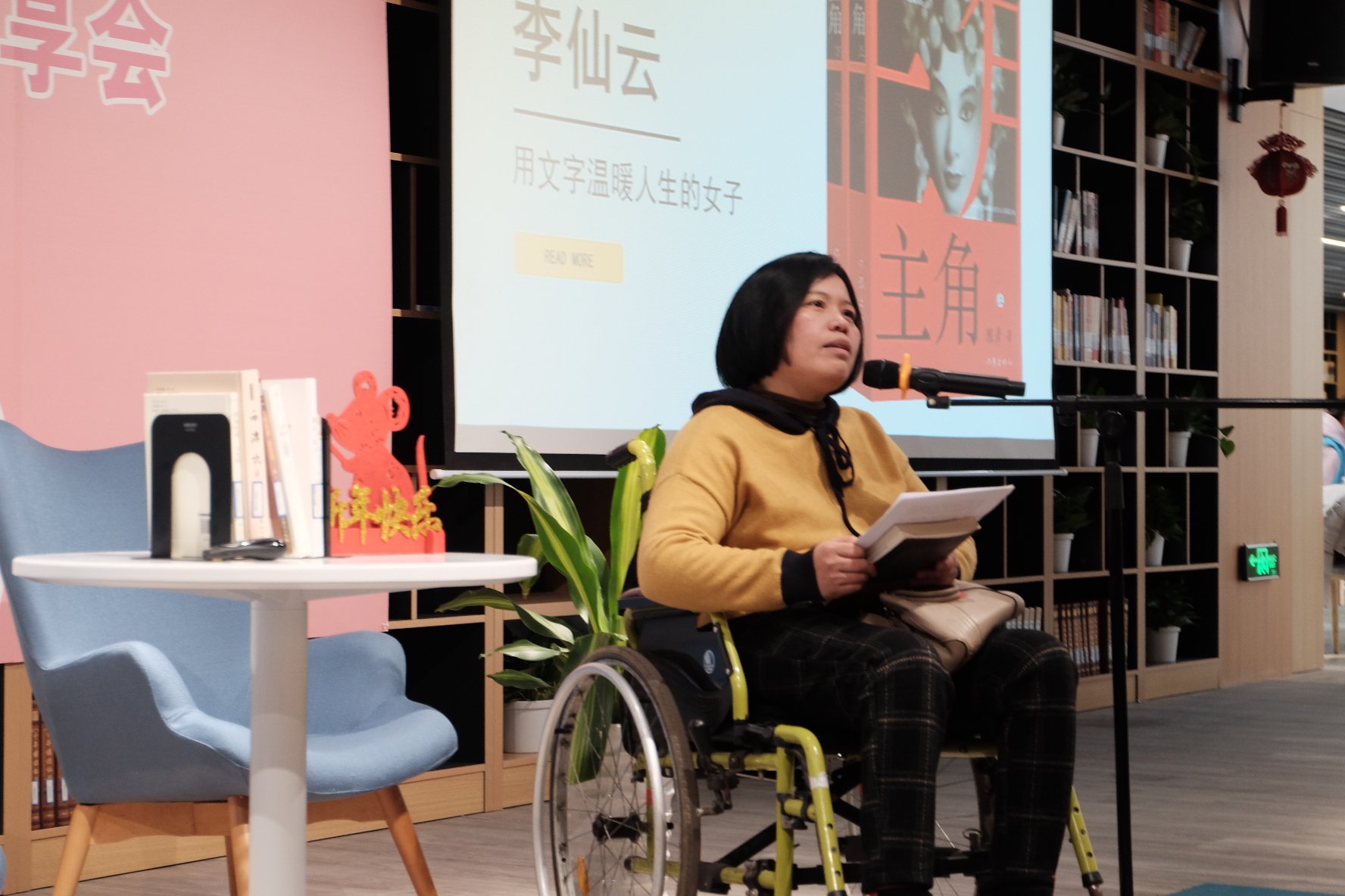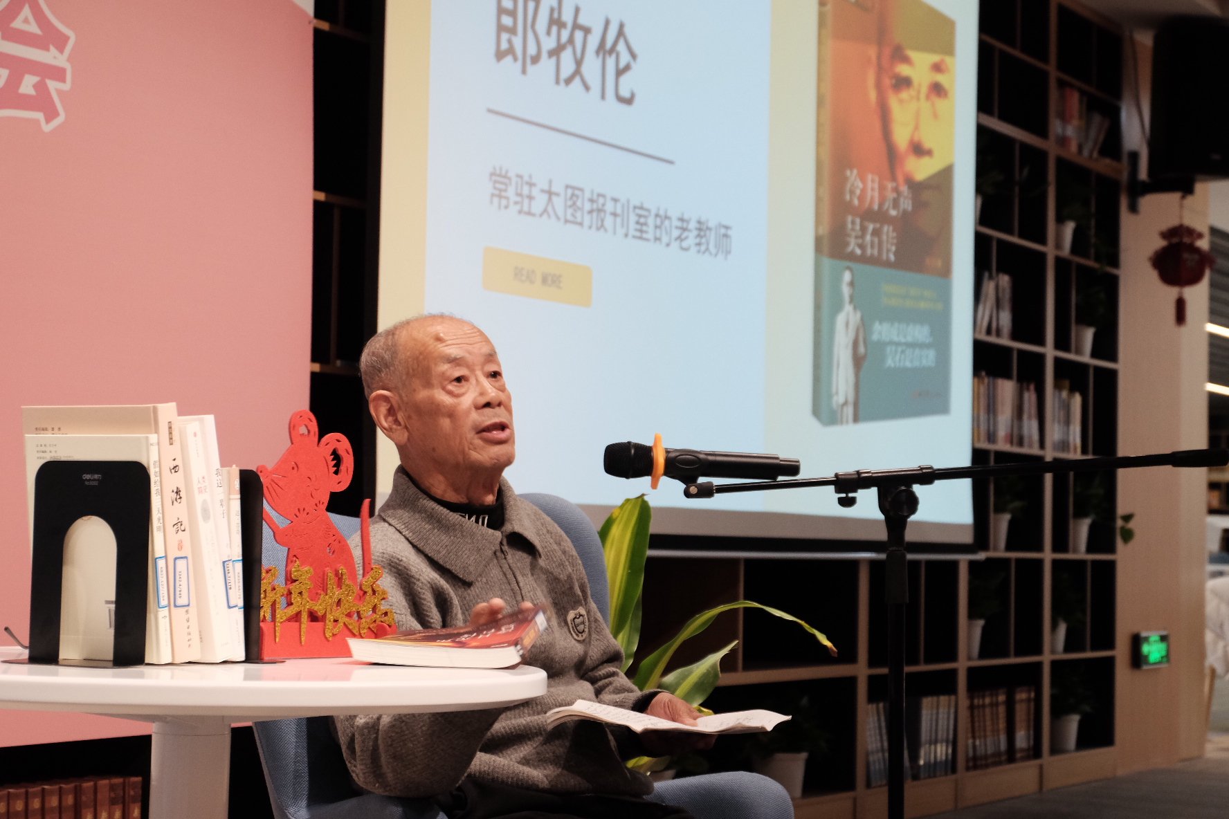 图书馆新辟出来的“阅读空间”在四楼,是一个横向很开阔的场子,中间有一根不可避免的承重柱。横向开阔,其实比纵向极深,对于分享者与听众的心理距离而言要好,但要让演讲照顾到“整个面”就略有一些难度了。分享演讲的时候,我多出了一些走动,尽量照顾到被这根中柱分割开来的左右两侧的观众。当然,为了让摄影师方便拍摄,我还是尽量地将走动限定在照明“光圈”的范围内。
