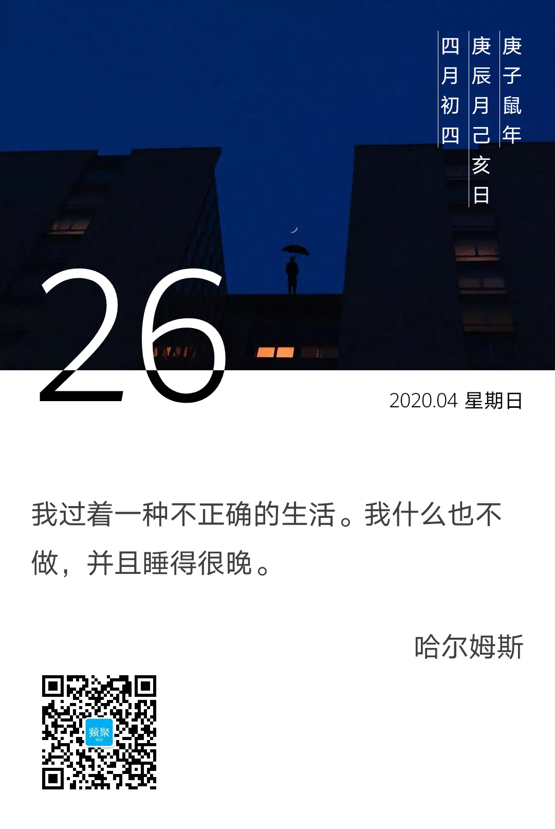 前苏联诗人丹尼尔·伊万诺维奇·哈尔姆斯这样写道:我过着一种不正确的生活。我什么也不做,并且睡得很晚。这大概也是对我们“上床”之后状态的写实吧,除了没有提及你我面对的那个荧荧发亮的屏幕之外。