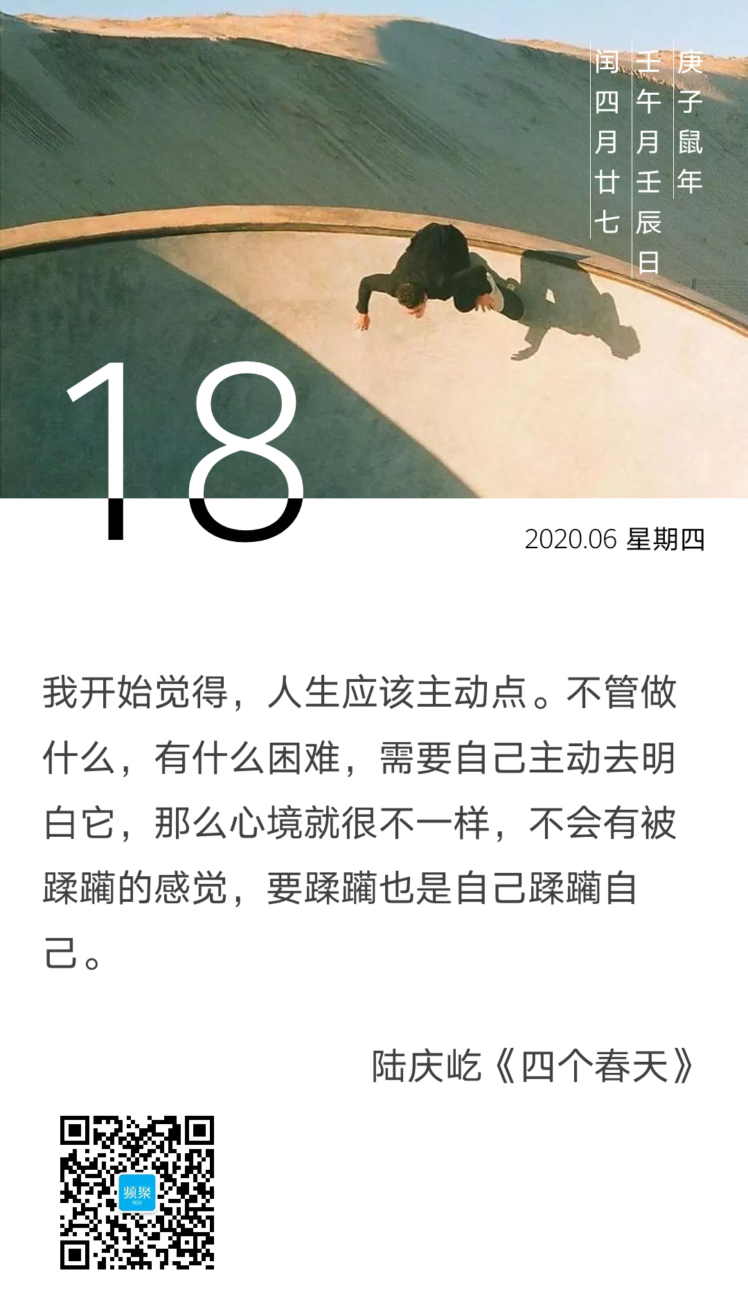 纪录片《四个春天》导演陆庆屹在他的同名书籍里这样写道:我开始觉得,人生应该主动点。不管做什么,有什么困难,需要自己主动去明白它,那么心境就很不一样,不会有被蹂躏的感觉,要蹂躏也是自己蹂躏自己。