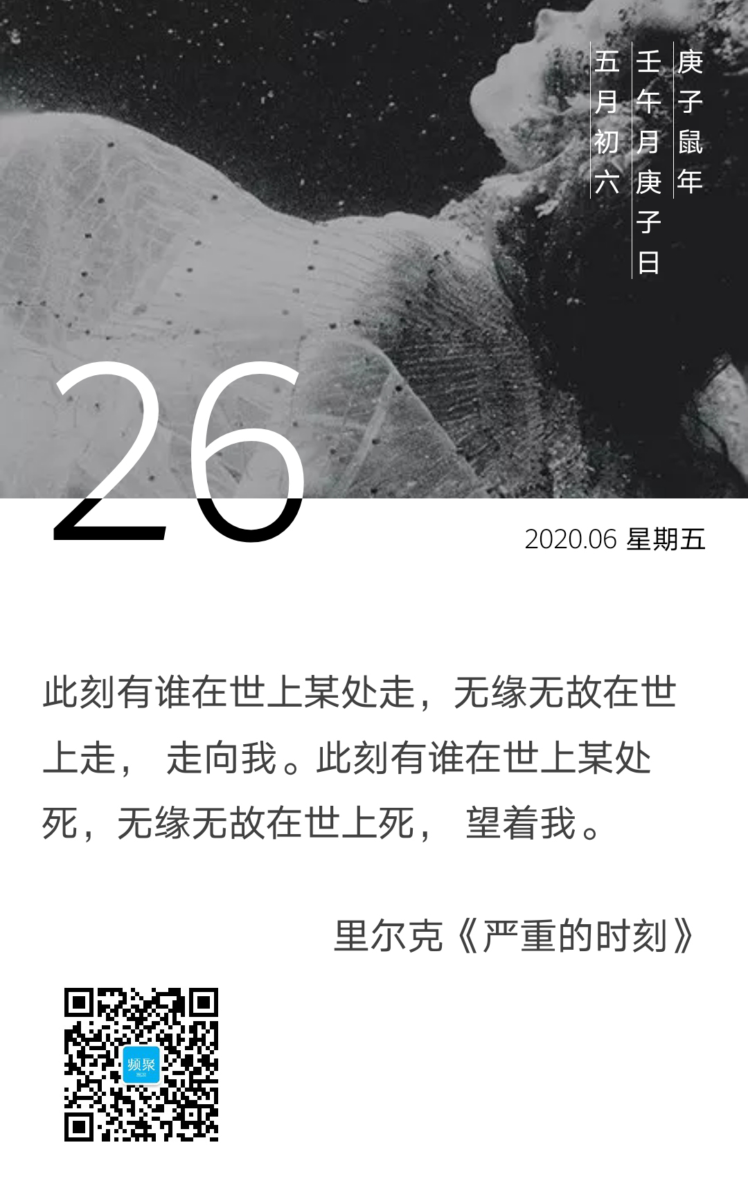 奥地利诗人里尔克在《严重的时刻》中写下这样的充满哲思的句字:此刻有谁在世上某处走,无缘无故在世上走,走向我。此刻有谁在世上某处死,无缘无故在世上死,望着我。