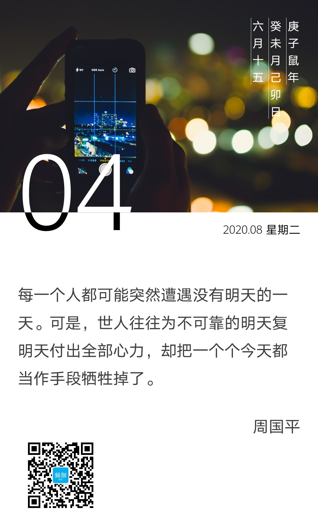 作家周国平曾说,每一个人都可能突然遭遇没有明天的一天。可是,世人往往为不可靠的明天复明天付出全部心力,却把一个个今天都当作手段牺牲掉了。