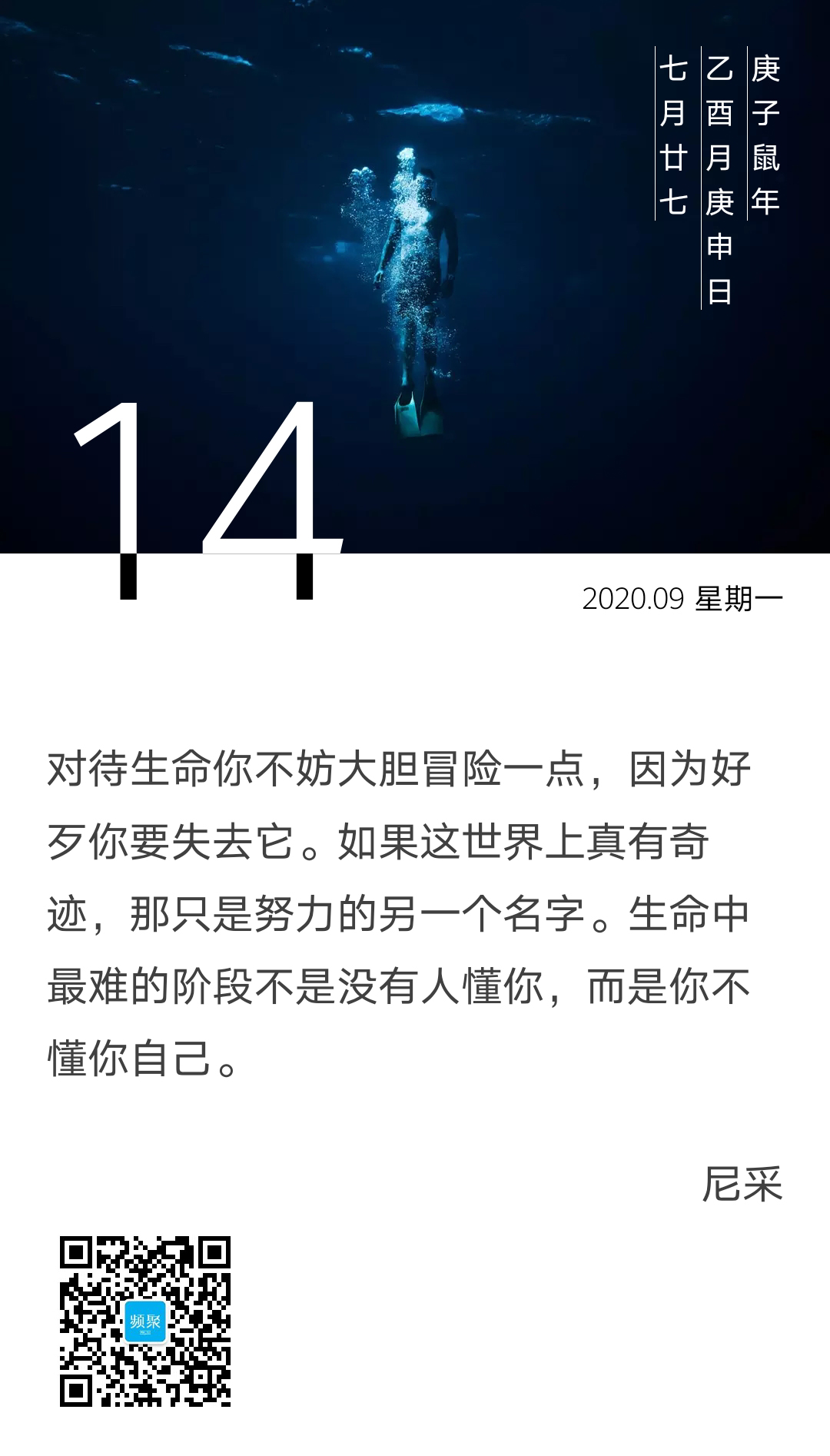 哲学家尼采曾说,对待生命你不妨大胆冒险一点,因为好歹你要失去它。如果这世界上真有奇迹,那只是努力的另一个名字。生命中最难的阶段不是没有人懂你,而是你不懂你自己。失败的时候,问问自己有没有拼尽全力,如果答案是否定的,信心会回来一些,下次拼尽全力试试,说不定会有不一样的收获;如果答案是肯定的,那么你也无憾了,自己的能力边界在这里,在需要保险的场合,只做保险的事情。