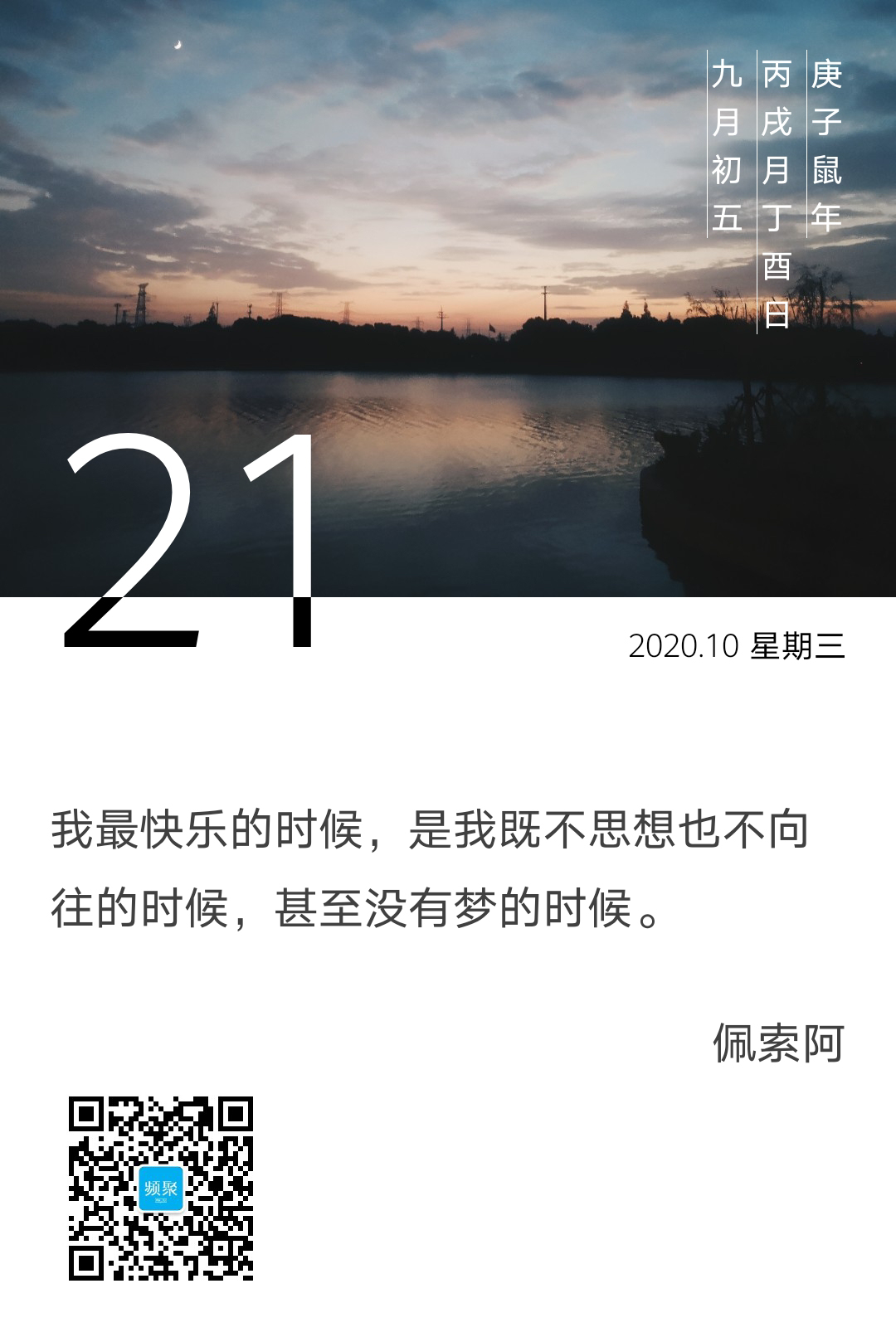 每个人都有自己的快乐和选择,以怎样的方式过完自己的一生都可以。葡萄牙诗人佩索阿曾说,我最快乐的时候,是我既不思想也不向往的时候,甚至没有梦的时候。这句话,我是认的。站在河岸边,我什么也不想,确实体验到那些自在的快乐。然而这个快乐是建立在我站在岸上的,而不是身处激流之中还需要拼命的处境。我会偶尔有些“丧”,但本质上我是仍有期待的,这些期待既包括完成一些自己早前设想好的、需要慢慢经营、一步一个脚印去成就的事情,当然包括一场无梦的酣眠。