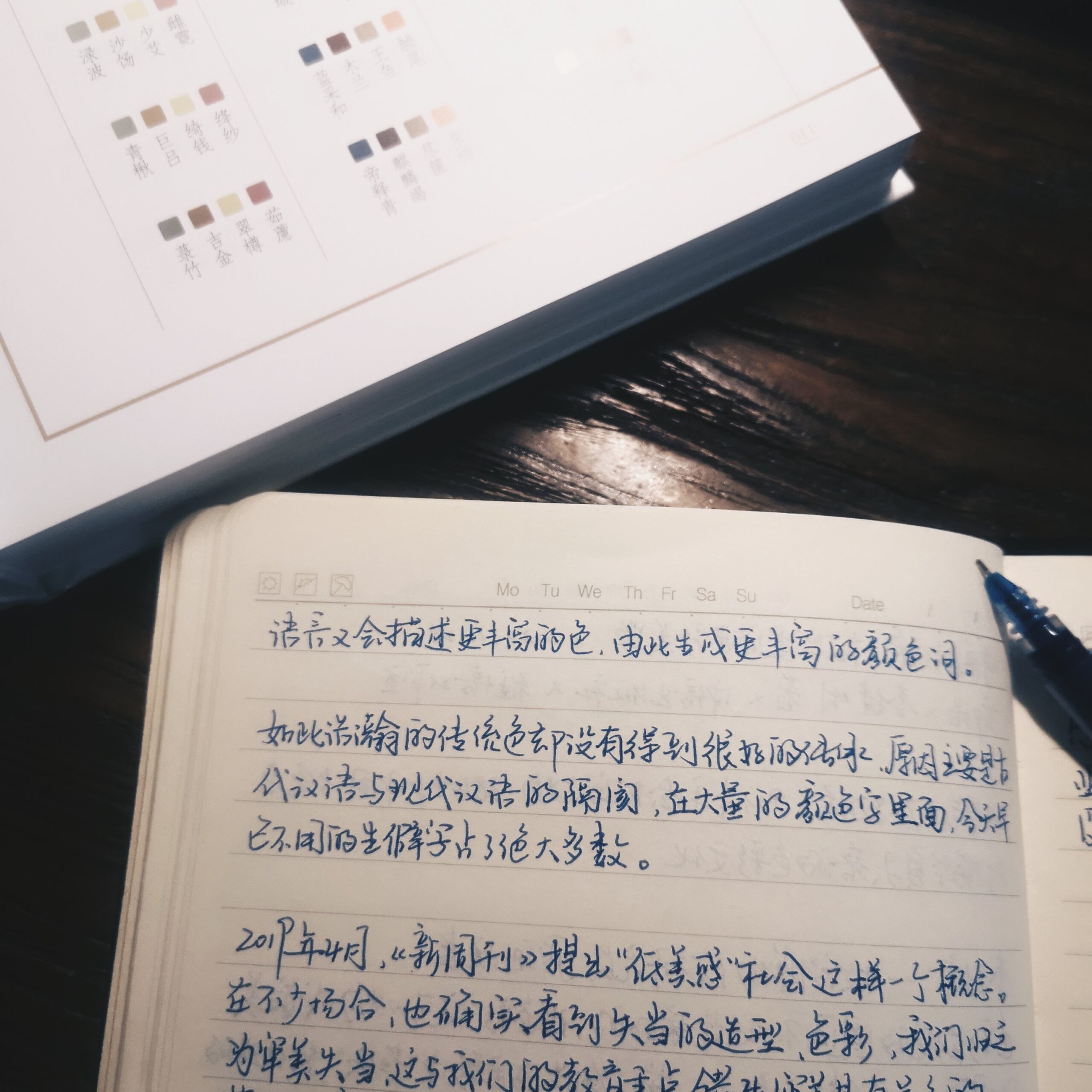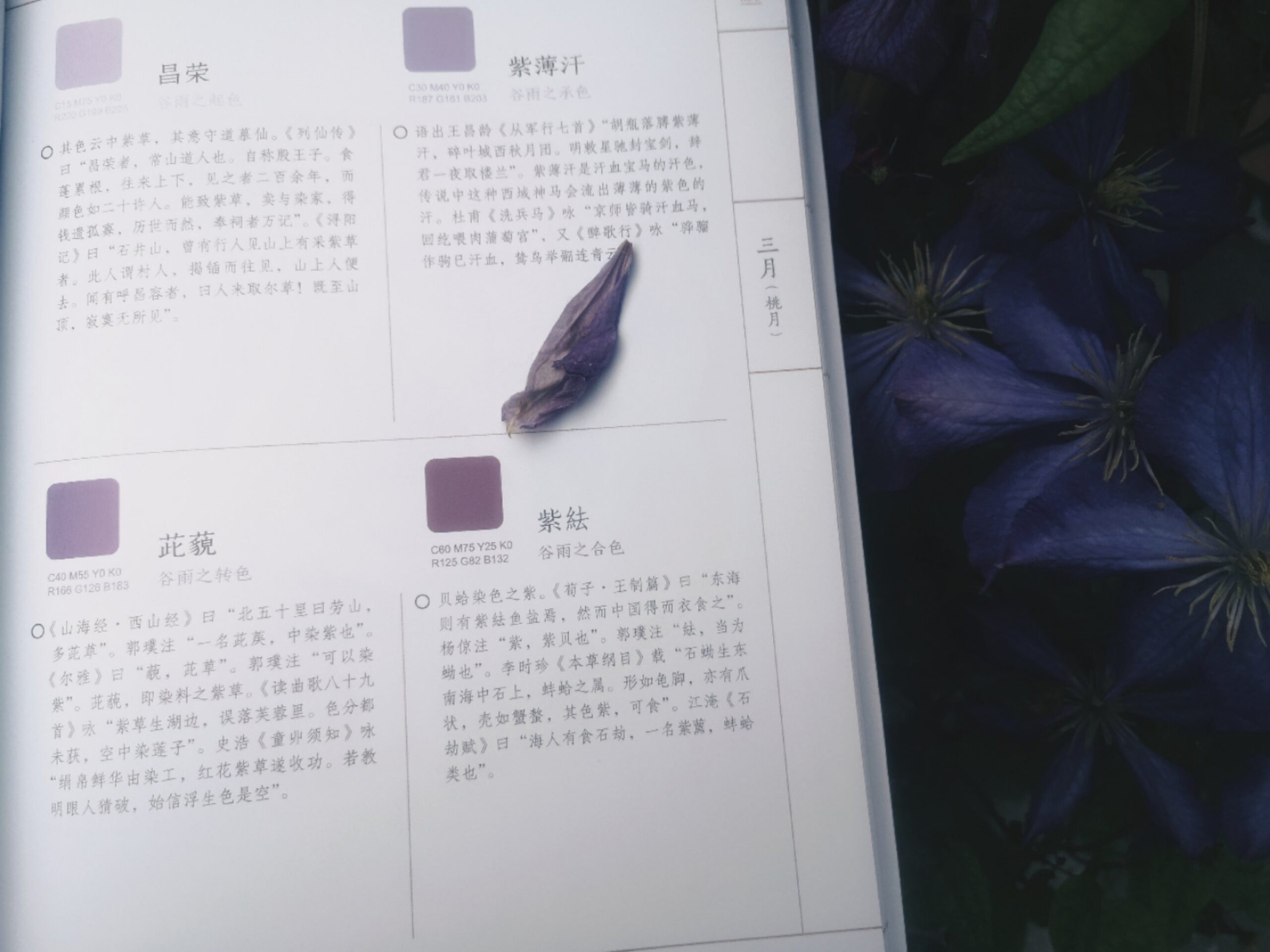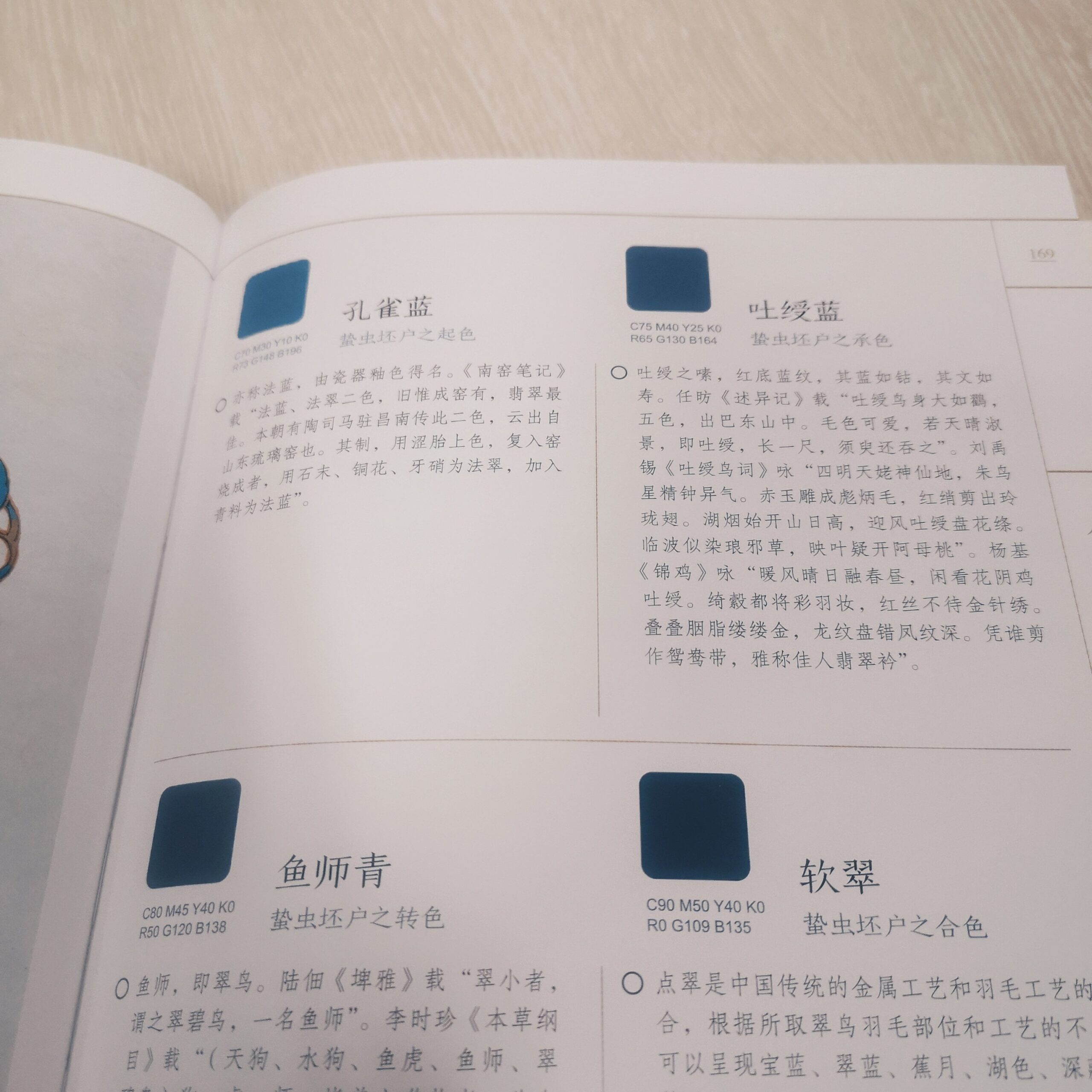 一旦你想要仔细琢磨某一个你喜欢的颜色,或者注解某个颜色的说明文字感兴趣的话,你就会很快意识到你面对的将是一片波澜壮阔的海洋,而这本书当中说明文字只是你在家中看到这片海的窗口而已。每个色彩的名字背后叠加了太多的文献资料、太多的历史实物、太多的诗词歌赋,沿着任何一个类向往里走,你都会看到一片巨大的、此生无法穷尽的海洋。