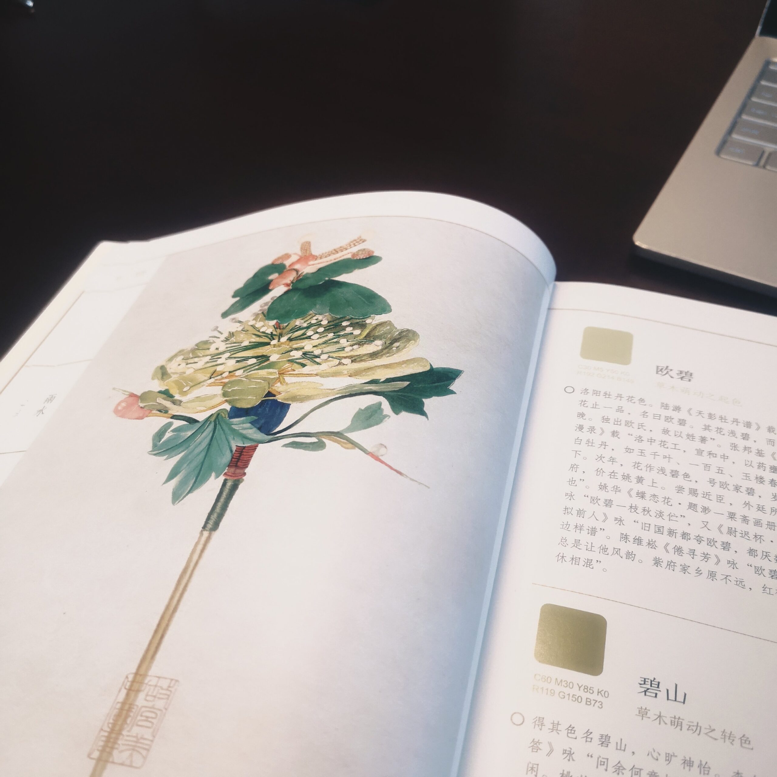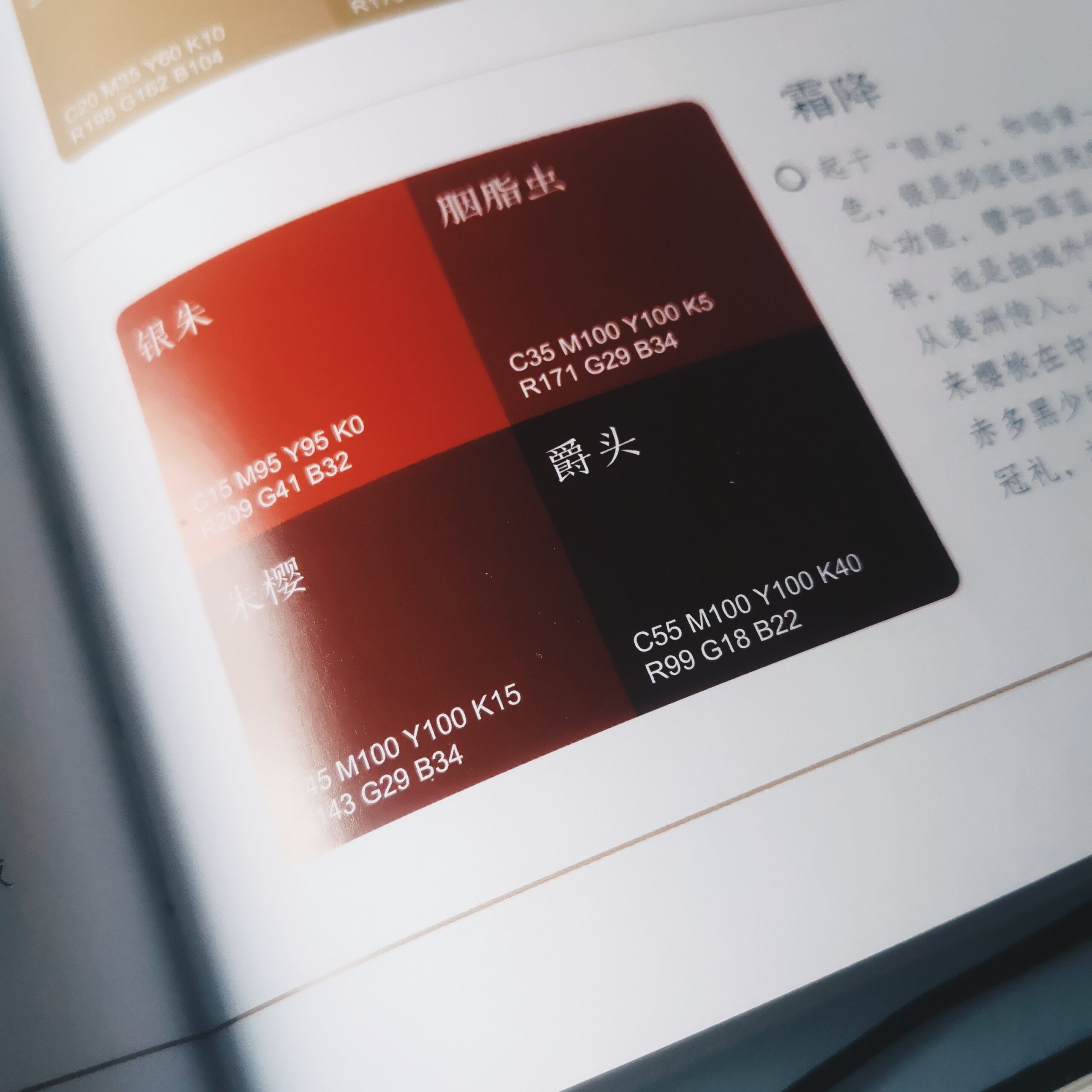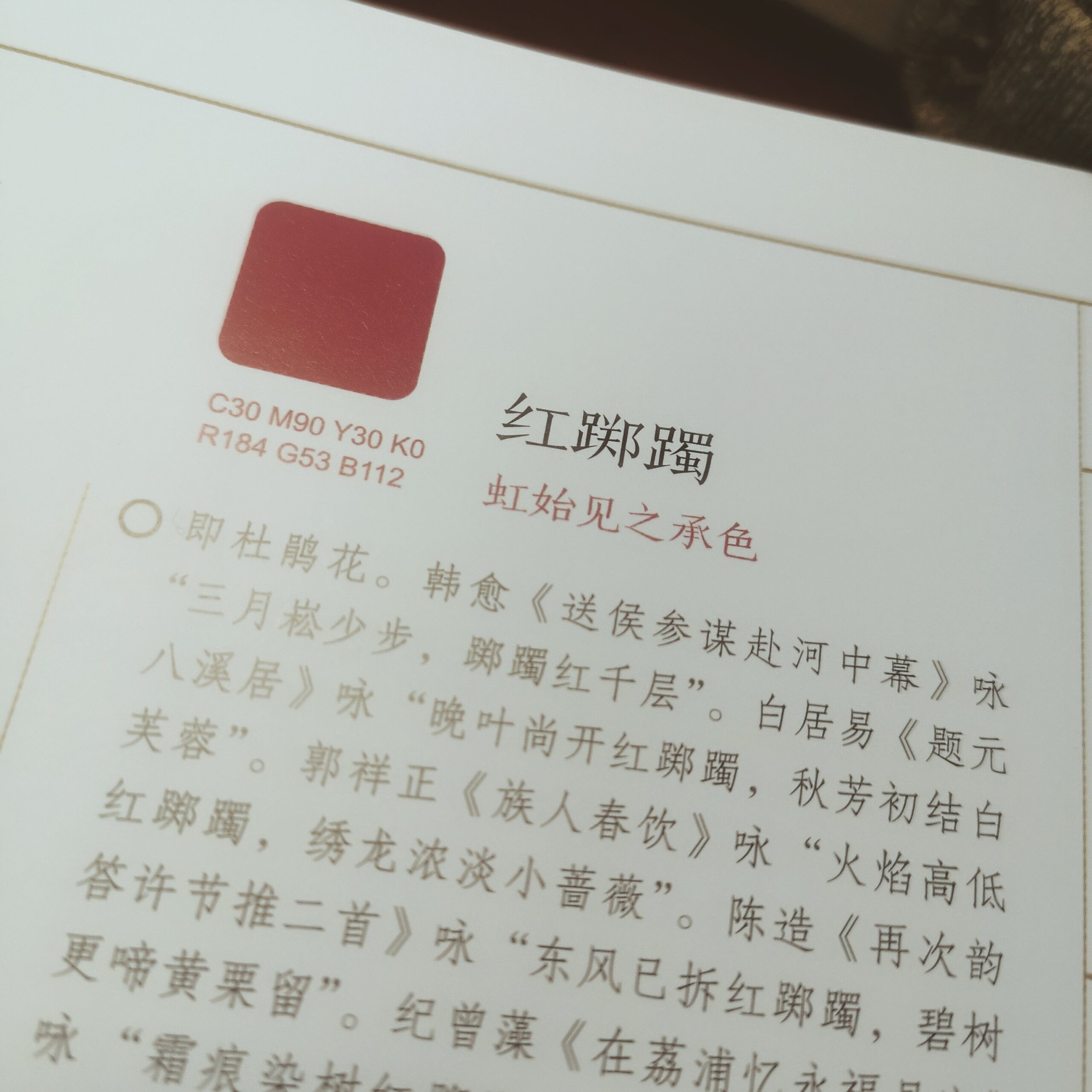 作为一本“色谱书”,除了用汉语来标示“中国传统色”外,每个色彩都标了CMY和RGB色彩标准数值。这对于从事设计的人来说,是一个特别有效率的事情,可以很快地在PS这样的软件中找到精准的定位,但对于这个色彩的文化内涵和情感意象却不太容易在这栏标准数值中得到,很多典故、很多出处、很多来由需要静下来细细地想过,才能在使用的过程之中让它更为妥当。