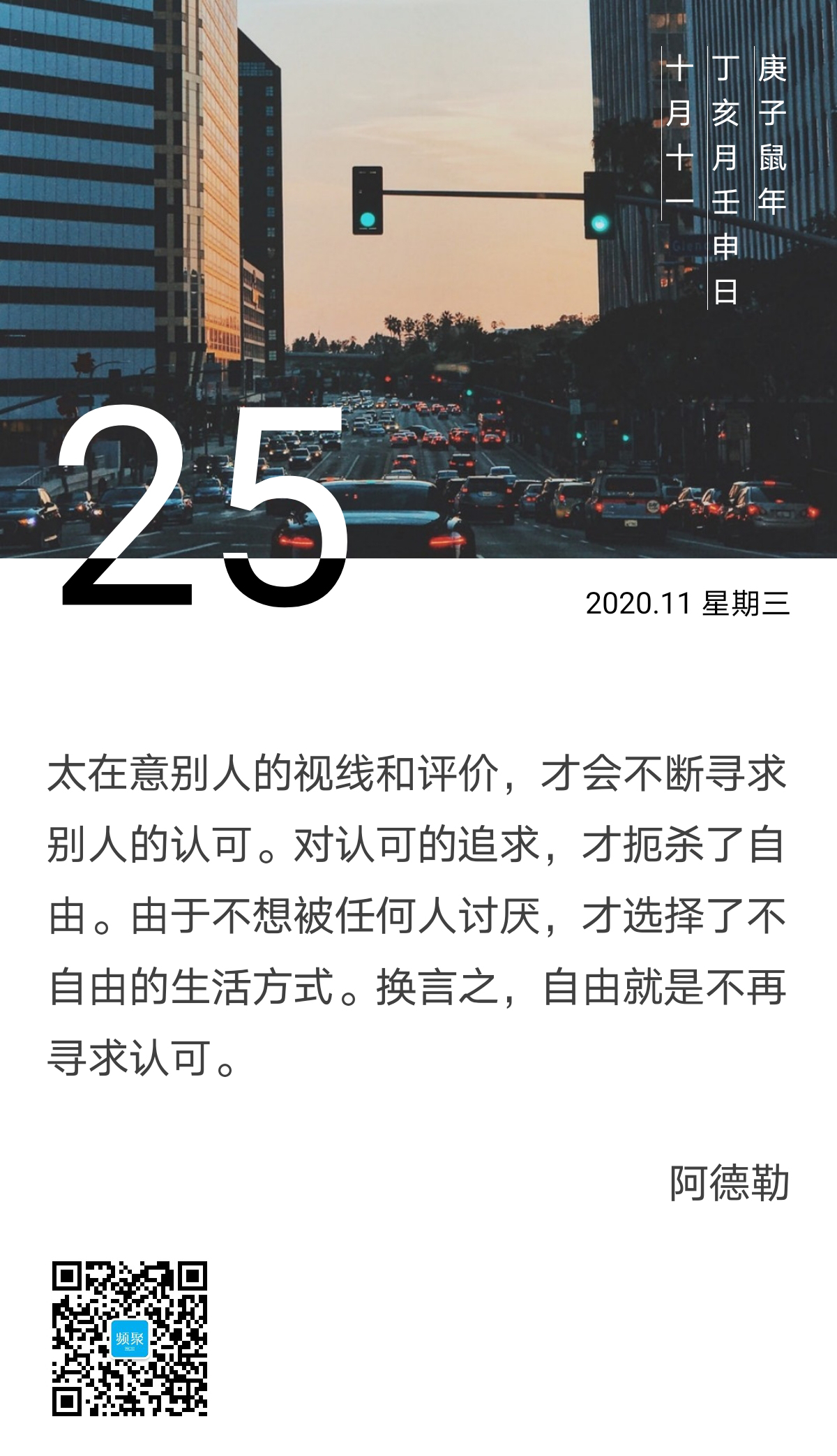 奥地利心理学家阿弗雷德·阿德勒曾说,太在意别人的视线和评价,才会不断寻求别人的认可。对认可的追求,才扼杀了自由。由于不想被任何人讨厌,才选择了不自由的生活方式。换言之,自由就是不再寻求认可。