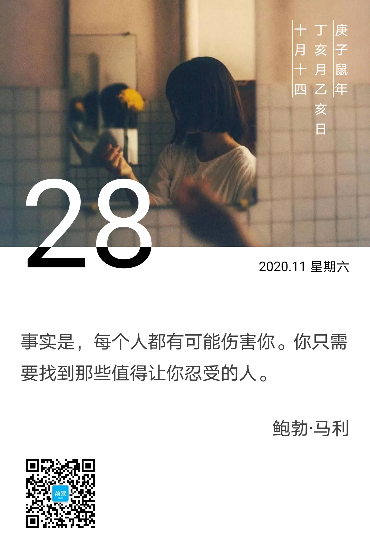 英年早逝的音乐人鲍勃·马利曾说,事实是,每个人都有可能伤害你。你只需要找到那些值得让你忍受的人。直白一些,就是这些伤害无可避免,就看你愿意给谁伤害了。我们通常都以“值得”这个字眼来概括情爱之中的“甘愿”。这个“甘愿”里面必定有卑微的求全,这个度也是极难把握的,也是极容易迷失自我的。