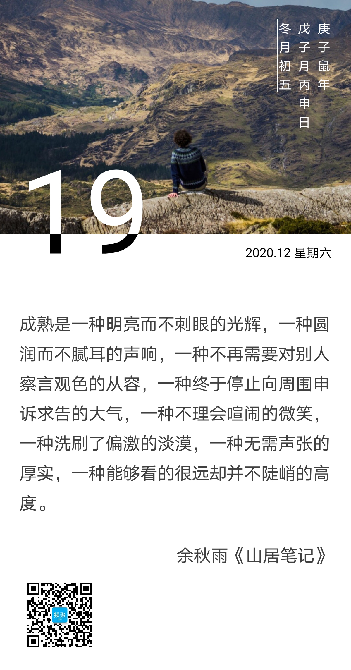 余秋雨在《山居笔记》之中有一段关于“成熟”的探讨:成熟是一种明亮而不刺眼的光辉,一种圆润而不腻耳的声响,一种不再需要对别人察言观色的从容,一种终于停止向周围申诉求告的大气,一种不理会喧闹的微笑,一种洗涮了偏激的淡漠,一种无需声张的厚实,一种能够看的很远并不陡峭的高度。