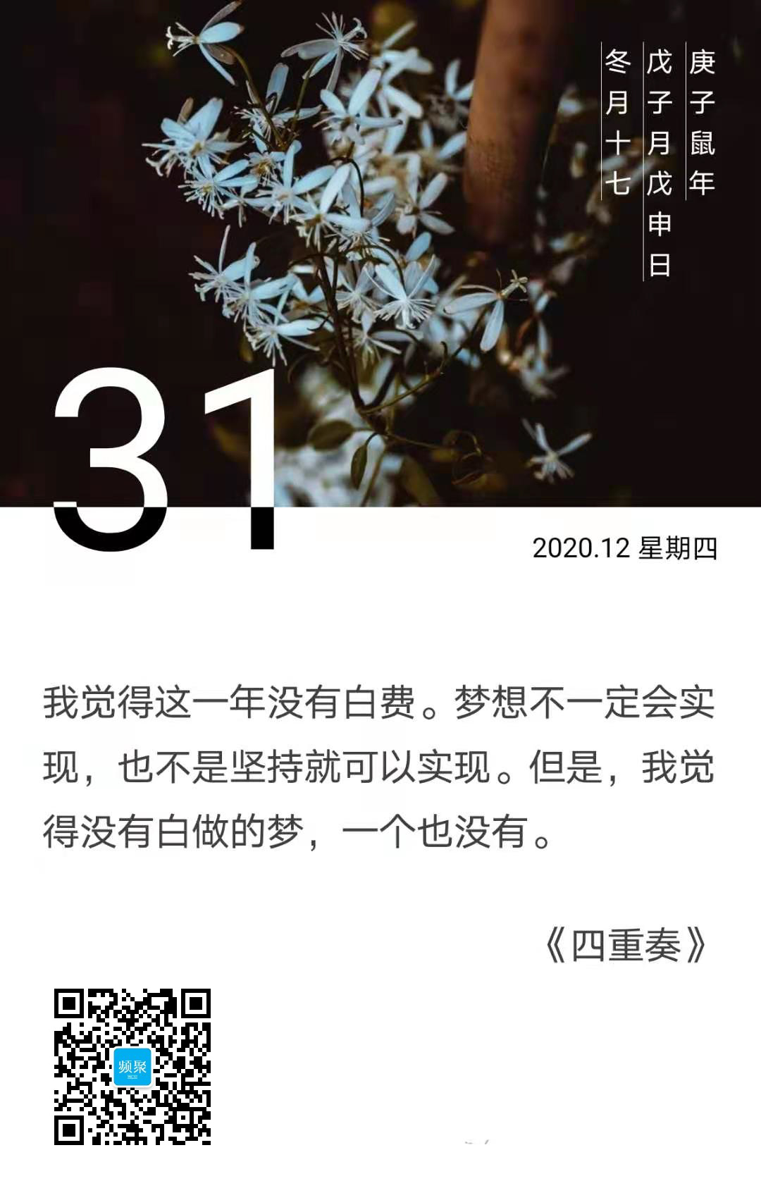 剧作《四重奏》里有这样的一句台词:我觉得这一年没有白费。梦想不一定会实现,也不是坚持就可以实现。但是,我觉得没有白做的梦,一个也没有。