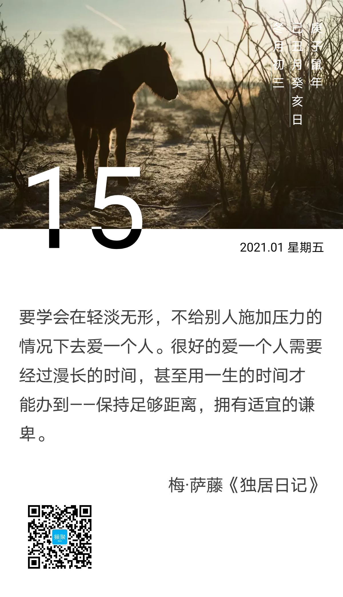 美国作家梅·萨藤在《独居日记》中这样写道:要学会在轻淡无形,不给别人施加压力的情况下去爱一个人。很好的爱一个人需要经过漫长的时间,甚至用一生的时间才能办到——保持足够距离,拥有适宜的谦卑。