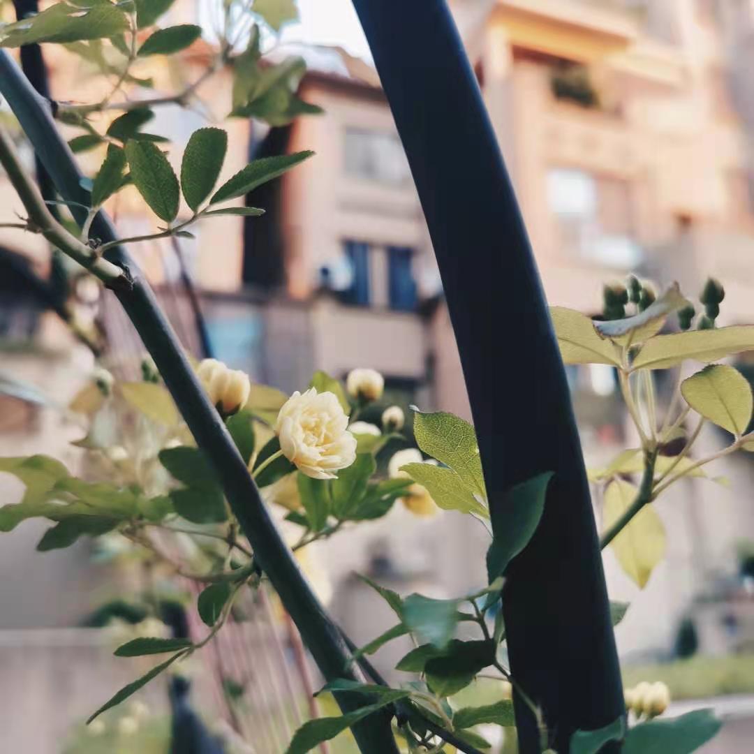 坚持到第三年,我终于有了一扇略微有些像样的黄木香拱门了。黄昏时,逆着光,丛生的黄色小花迎风摇曳,美极了。