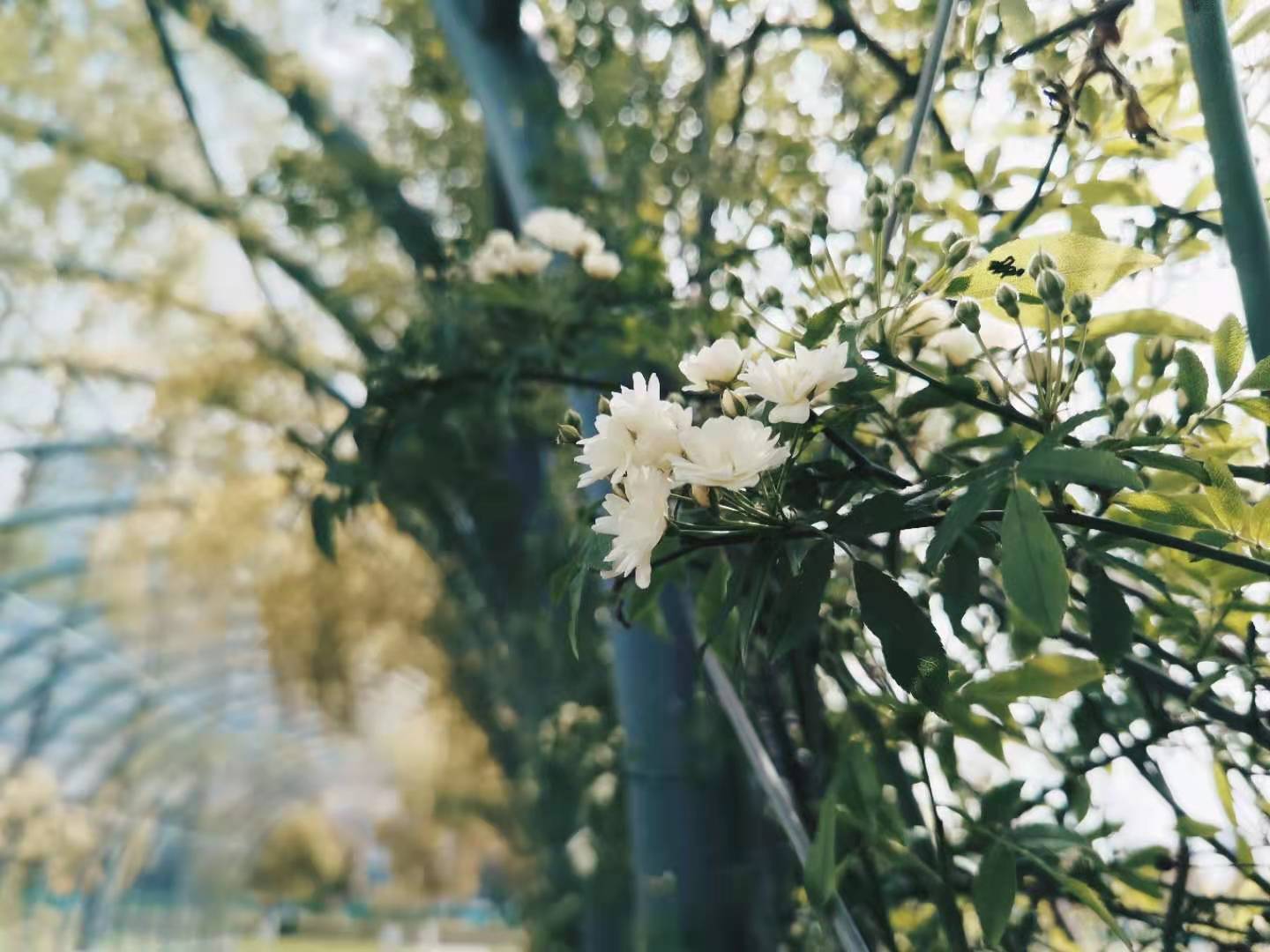 今天中午得空就去看了看。将车停在附近破败的厂房的空地上,才发现要走过还要有一段路。顶着中午20多度的气温,越走越觉得自己没有将车停在更近一些地方。等看到那高大的廊架,如潮一般的花藤,心头的懊恼就淡去许多。