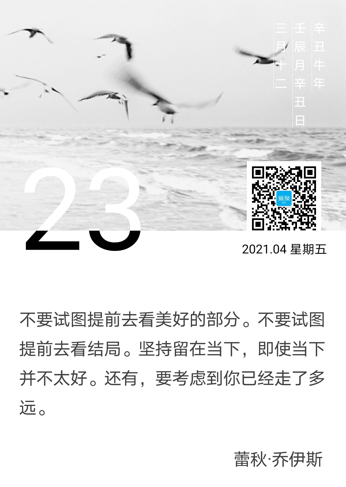 不要试图提前去看美好的部分。不要试图提前去看结局。坚持留在当下,即使当下并不太好。还有,要考虑到你已经走了多远。