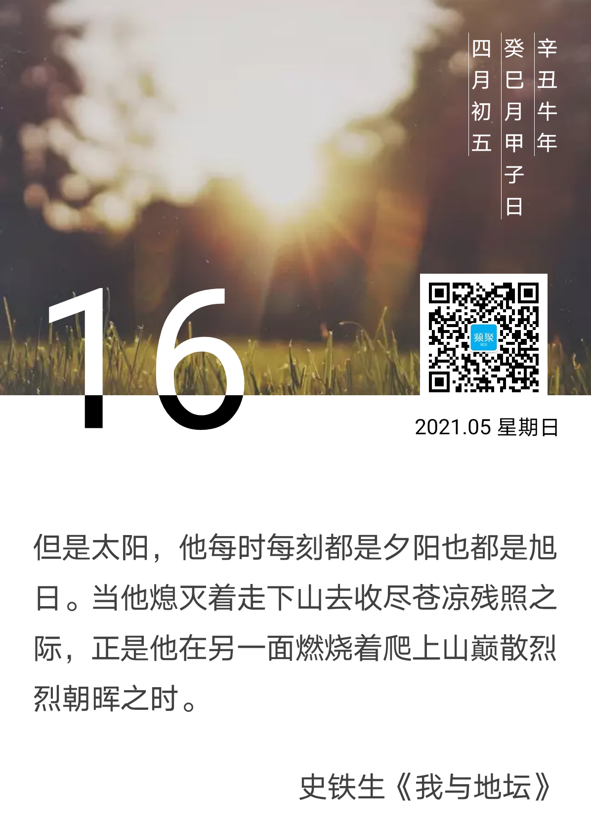 但是太阳,他每时每刻都是夕阳也都是旭日。当他熄灭着走下山去收尽苍凉残照之际,正是他在另一面燃烧着爬上山巅散烈烈朝晖之时。