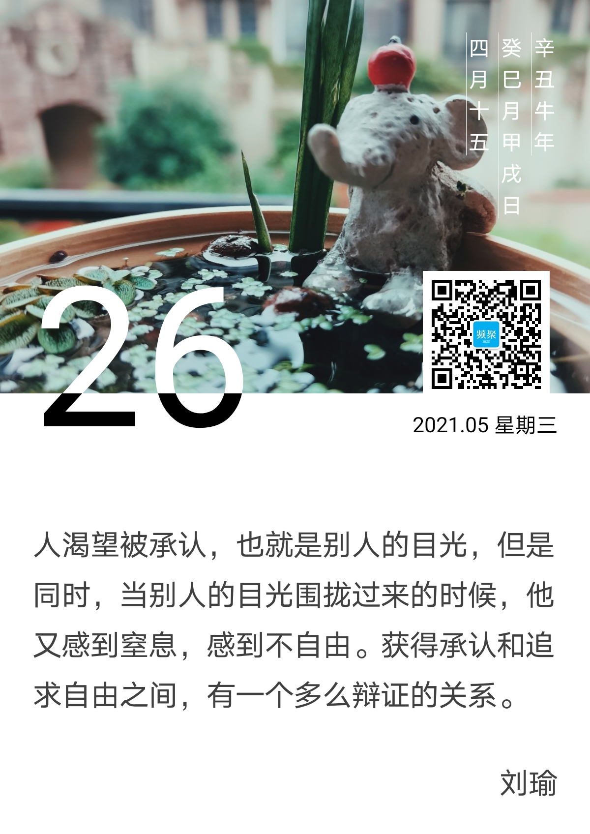 不仅仅在获得承认和追求自由之间有一个需要推敲的辩证关系,其实在自己能做什么以及想要做成什么,在迅速成长和更多质疑之间,同样也有一个需要推敲和审视的辩证关系。