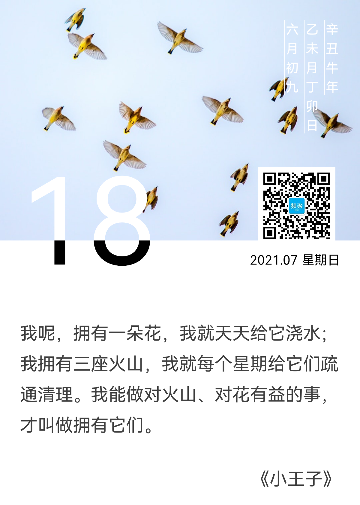 我呢,拥有一朵花,我就天天给它浇水;我拥有三座火山,我就每个星期给它们疏通清理。我能做对火山、对花有益的事,才叫做拥有它们。