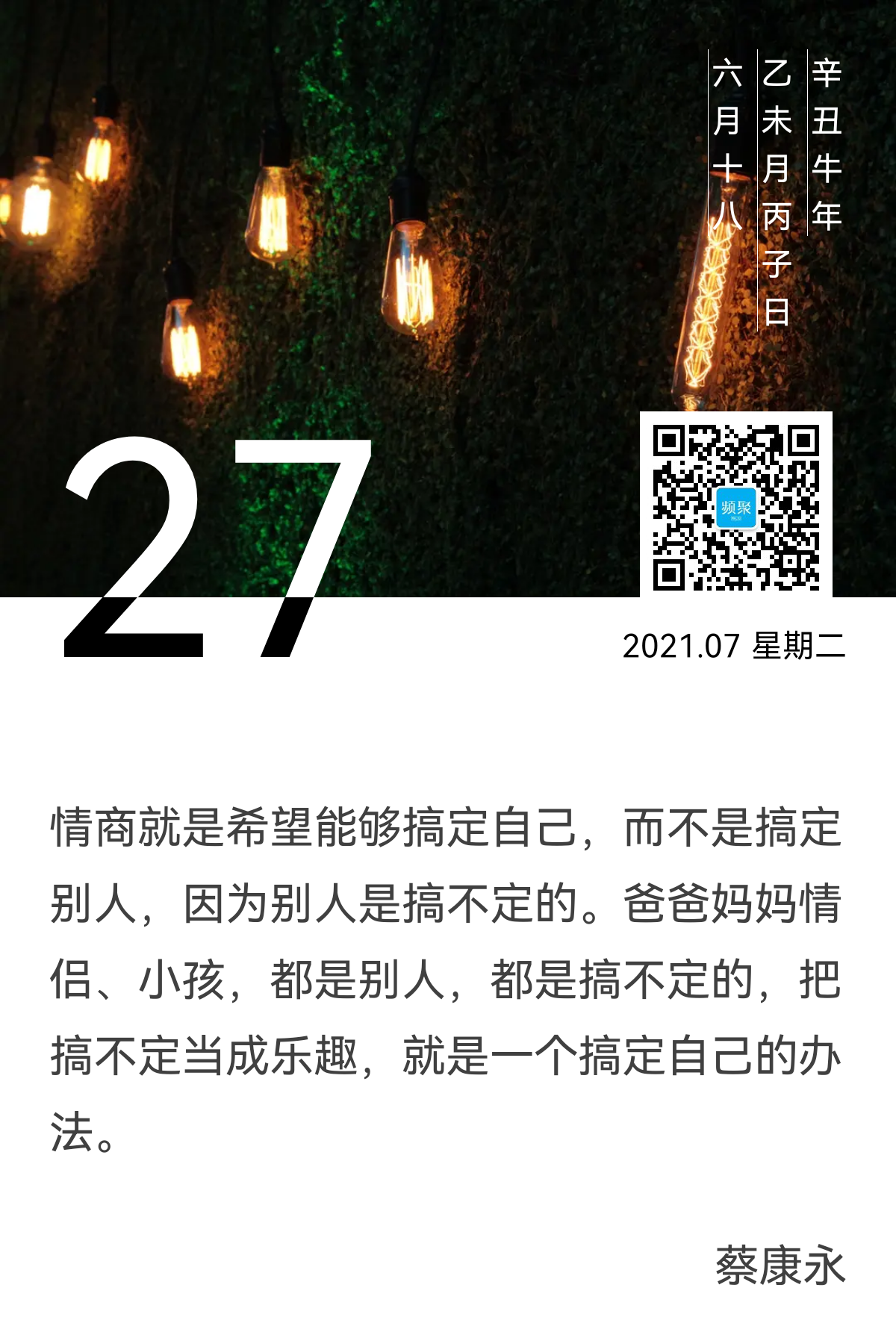 情商就是希望能够搞定自己,而不是搞定别人,因为别人是搞不定的。爸爸妈妈情侣、小孩,都是别人,都是搞不定的,把搞不定当成乐趣,就是一个搞定自己的办法。