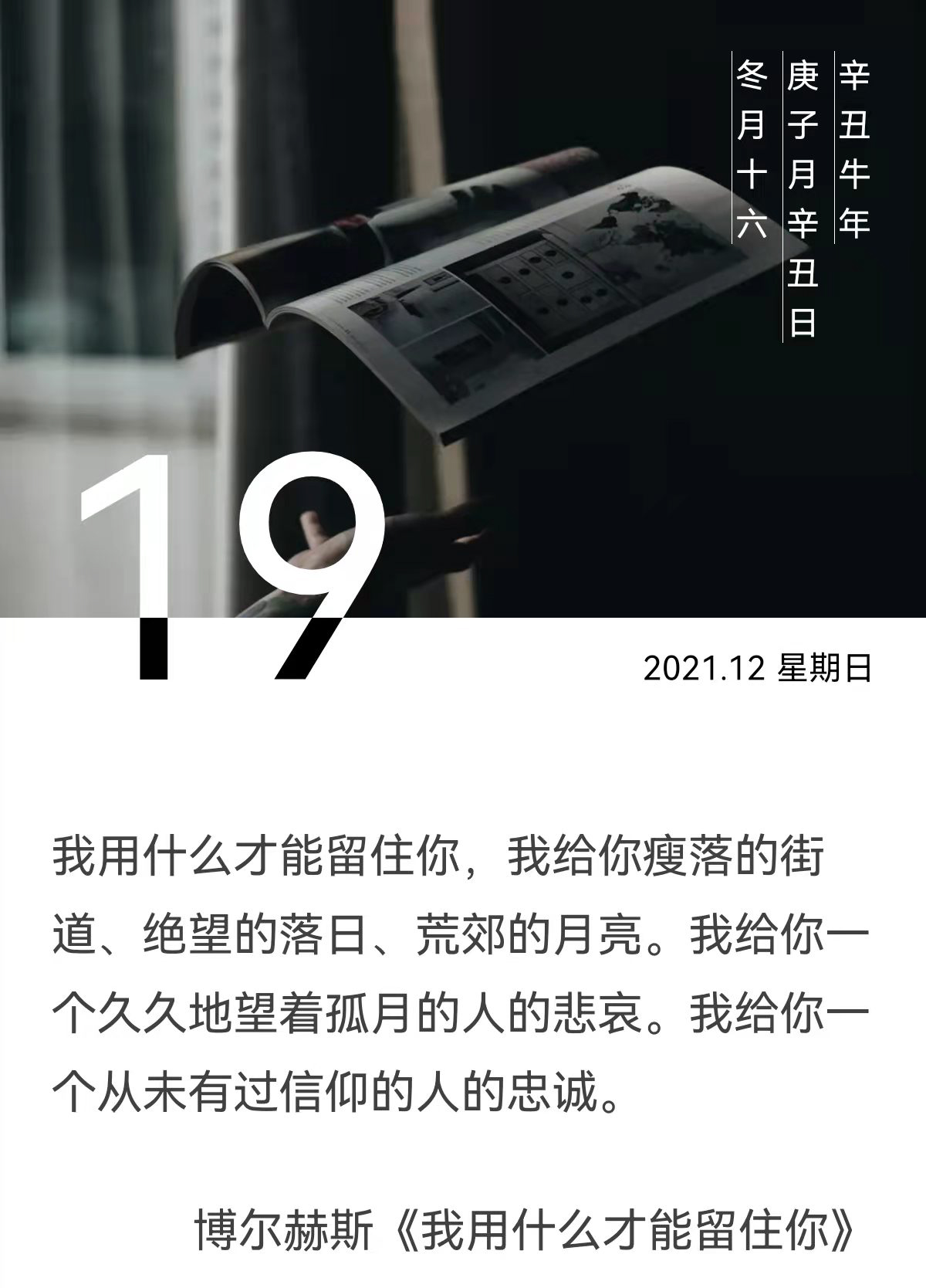 我用什么才能留住你,我给你瘦落的街道、绝望的落日、荒郊的月亮。我给你一个久久地望着孤月的人的悲哀。我给你一个从未有过信仰的人的忠诚。