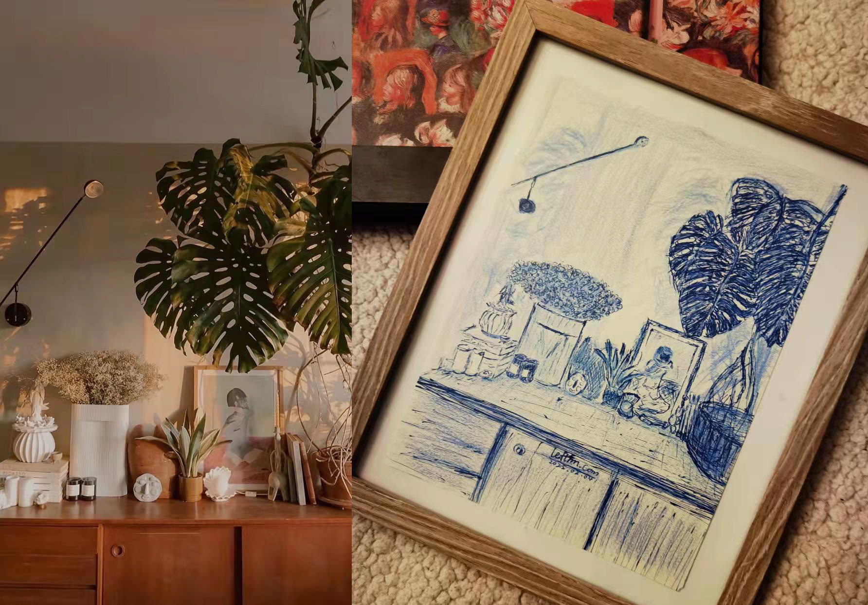 知道点皮毛,但并不精通,也没有将它转化成能够为自己“赋能”的生存本领,但这并不影响在这些“浅薄”里收获愉悦感。看到一张喜欢的照片,找来速写本用中性笔将它“画”下来,又找来彩铅为它补上阴影氛围,然后尝试着将它裁剪至视觉“平衡”的状态装进相框,拍照发在社交平台上“装一会儿”。