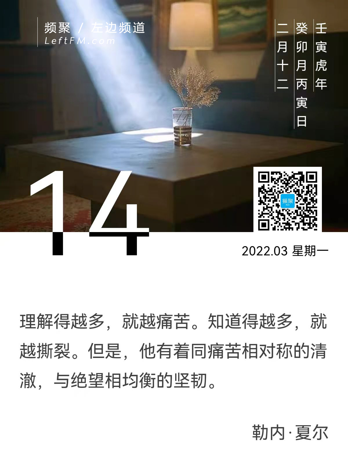 理解得越多,就越痛苦。知道得越多,就越撕裂。但是,他有着同痛苦相对称的清澈,与绝望相均衡的坚韧。