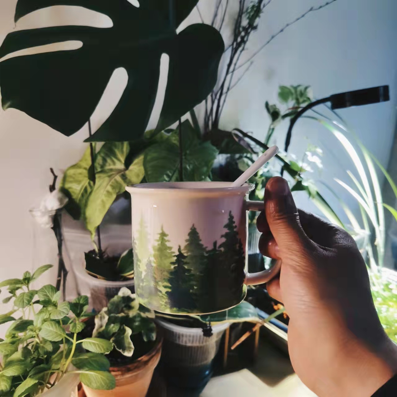 最近很宠的一个新杯子,非常明确的“森系”风格,大概符合我“绿手指”的新人设吧。细细算过来,我有无数的水杯,散落在各处,单某处的办公地点,可能就有不下十个。此处,又call back前面的囤积问题了。