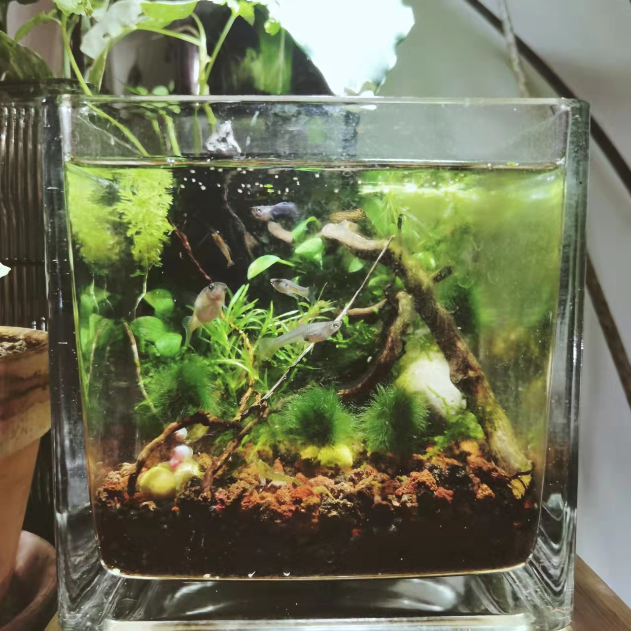 这个mini小鱼缸,原本只是水培的花器。作为鱼缸,它的清透性并不好。我放了些火山石、杜鹃根和水草,胡乱地“造”了个景,用了一个旧的瀑布过滤器,扔了几条原生的孔雀鱼在里面。大半年了,它们都活得很好,后来生的两三条小鱼也健康长大了,因为空间过于局促,被我养在了其他缸里。