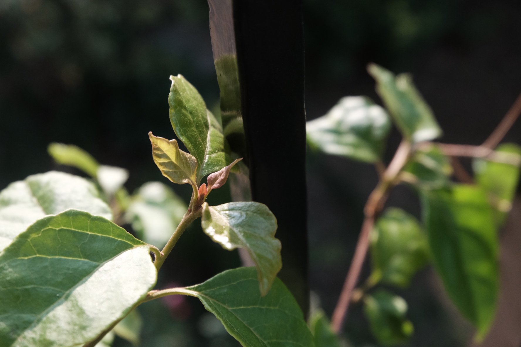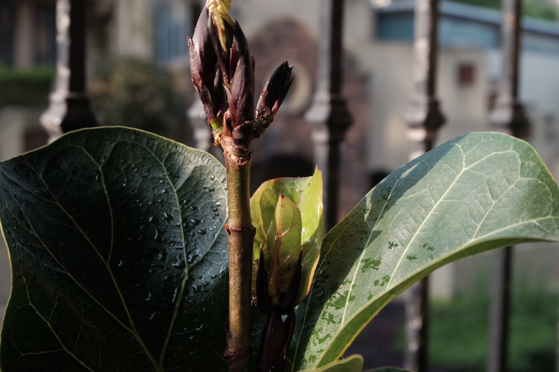 被我无情砍头之后,已经进入分枝状态的琴叶榕。这棵,我入手时还不到30公分,去年一个夏天就已经长成一个90cm的独杆,可能还是气候条件的问题,太瘦弱了,长得像跟鸡毛掸子。今年春天,下狠手给它打了一个顶,截成80cm高。一个多月,生出了六个头,我又考虑到后续株型的问题,将方向过密的两个新芽头给“抹去”了,只留了东西南北四个芽点,希望它将来是根棒棒糖的形状。这个在福建两广地区,都是当行道木来用的植物,种在花盆里也是太委屈它了。
