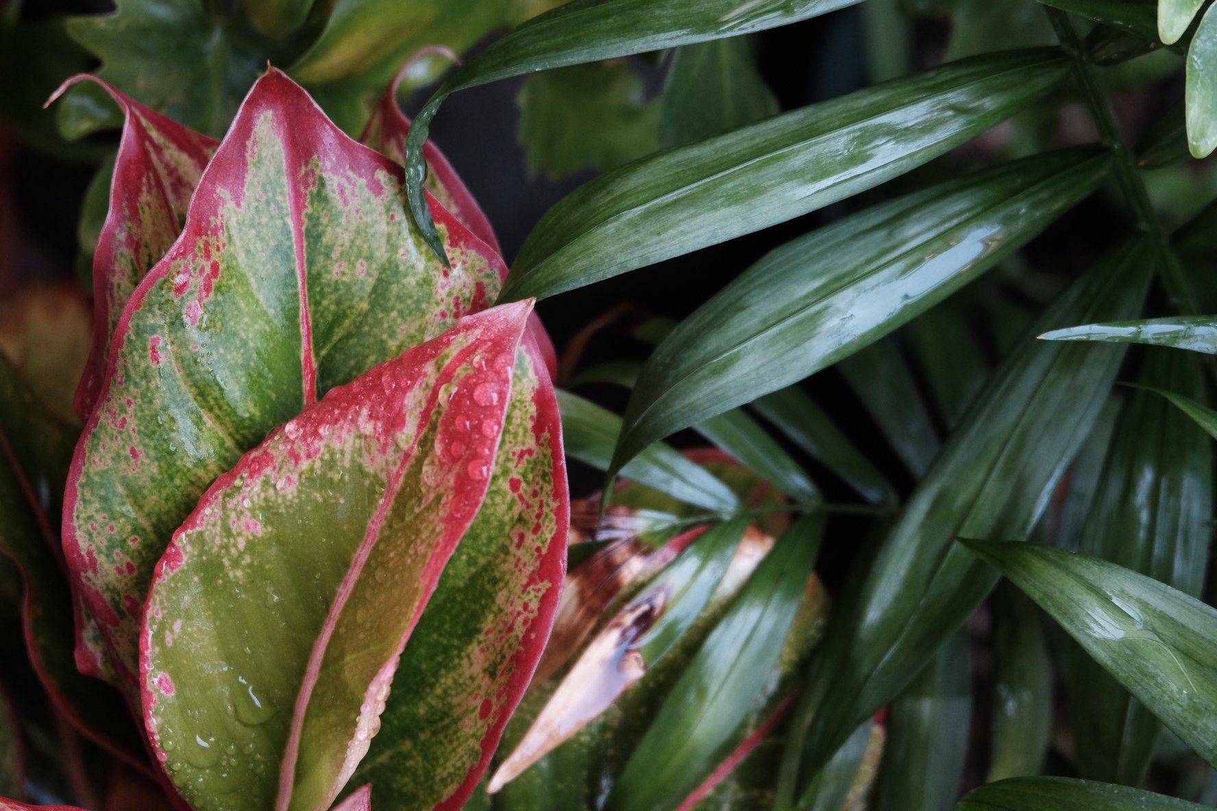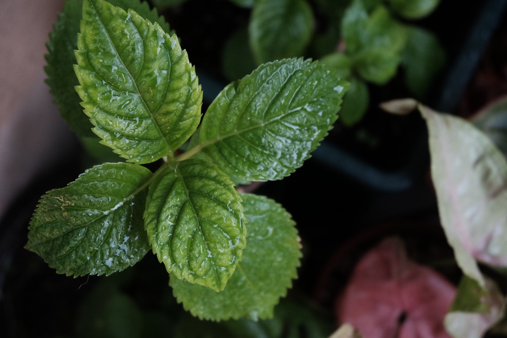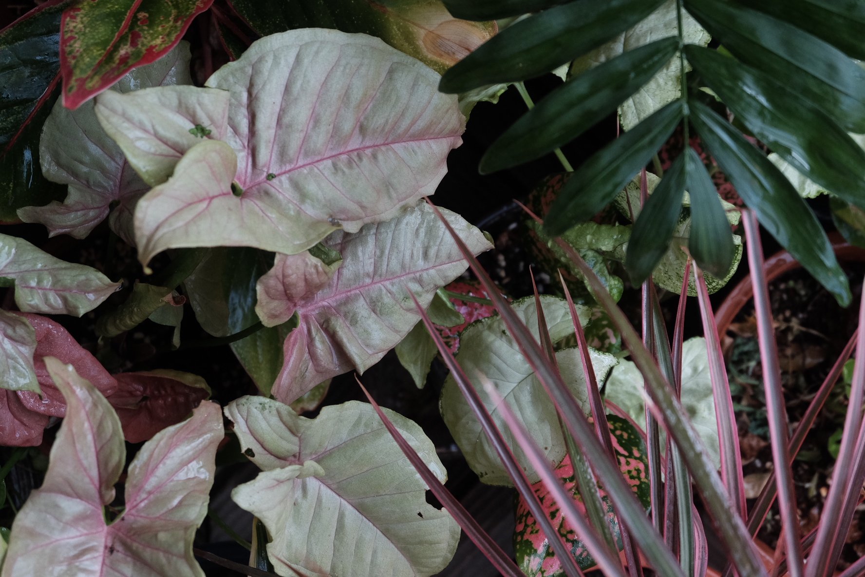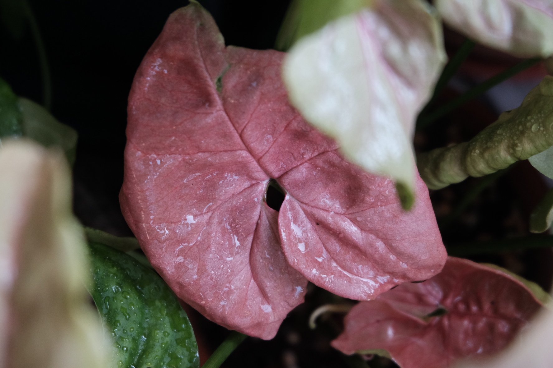 这种合果芋的商品名叫“粉红佳人”,初生的叶片是这种粉红色的,在强光的照射下,叶背会呈现出青绿色,粉色会消退掉一些。此类植物原生地多半是雨林,大水、大肥、大太阳,能长成特别蓬勃的一丛。