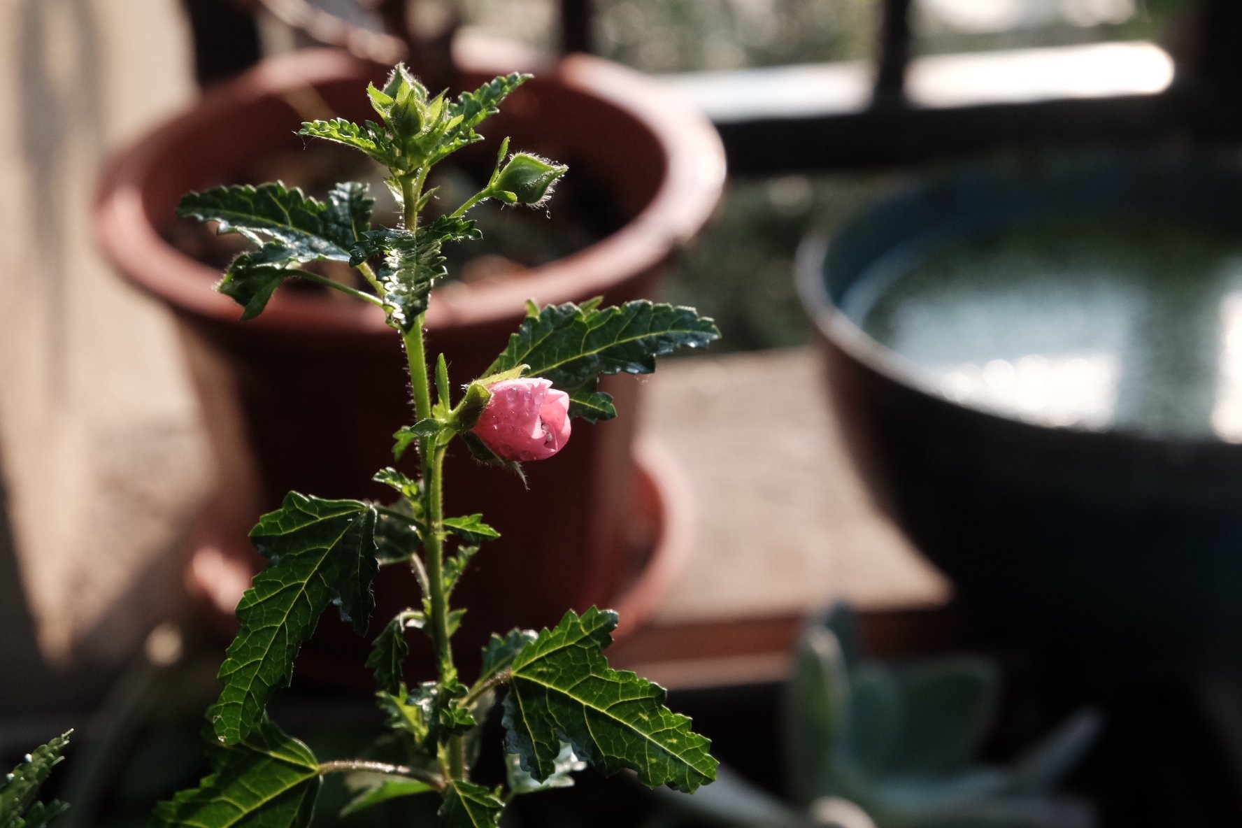 阳台爆花机器“小木槿”,这是它今年的第一朵花含苞待放的状态。它也是属于那种合适大水、大肥、大太阳的植物,而且需要勤修剪,不断地修剪促进萌发新芽点开更多的花。不过,小木槿特别怕旱,春夏几乎一天要浇两遍水。因为它没有主根,都是毛细根,所以一旦缺水,用灌根的办法也救不回来,尤其是在“秋老虎”的时候,空气湿度低,干得特别快,很容易一不当心就没了。但有一个补救的办法,就是修剪下来的花枝,及时插回地原盆里,小家伙生命力强,主株秋旱死了,新插的往往能挺过来。别问我是怎么知道的?