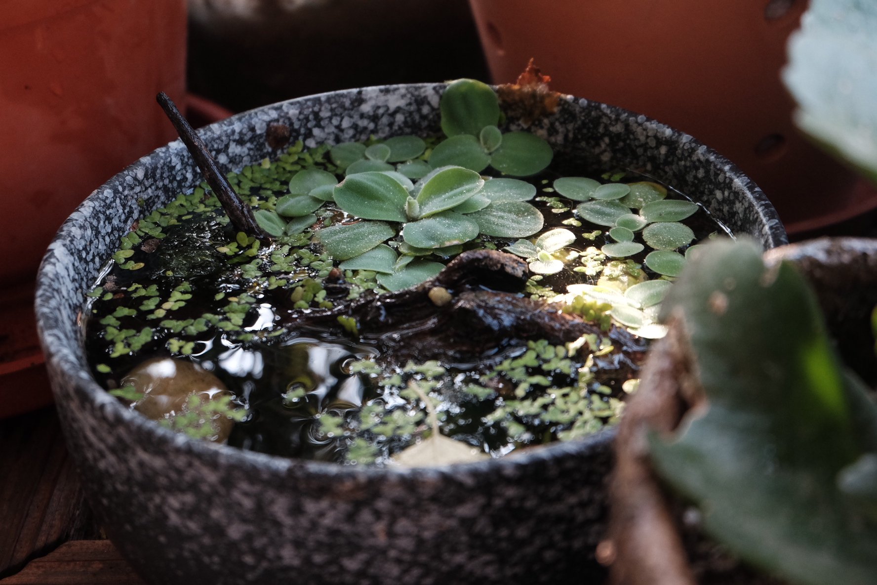 去年玩碗莲的时候,买了好多小碗,后来又陆陆续续转去育青鳉苗。冬天,干了,也不用管它。春天蓄满一碗水,又是一个小景。如果担心生蚊子,只需要放一尾鱼进去就好。