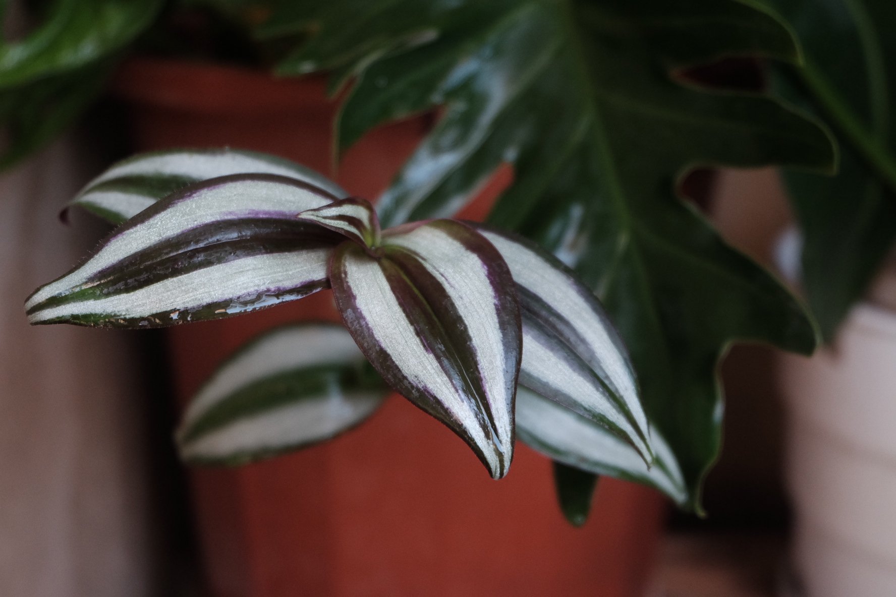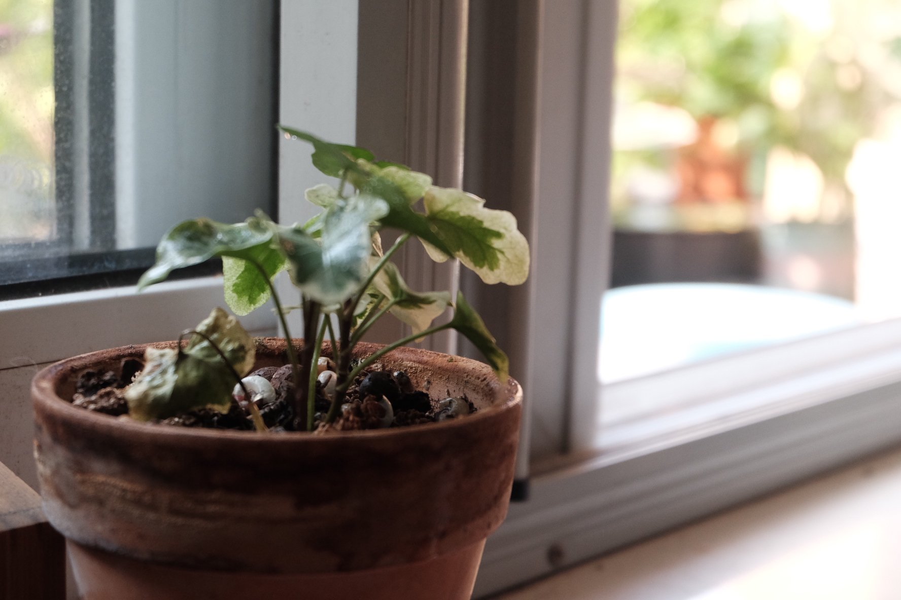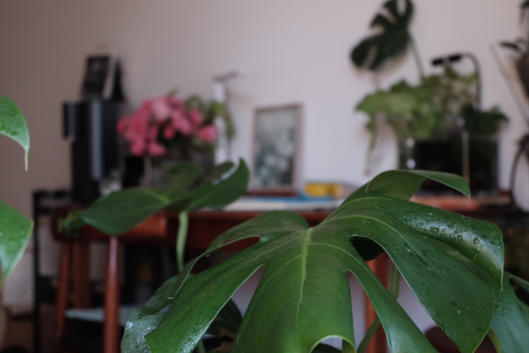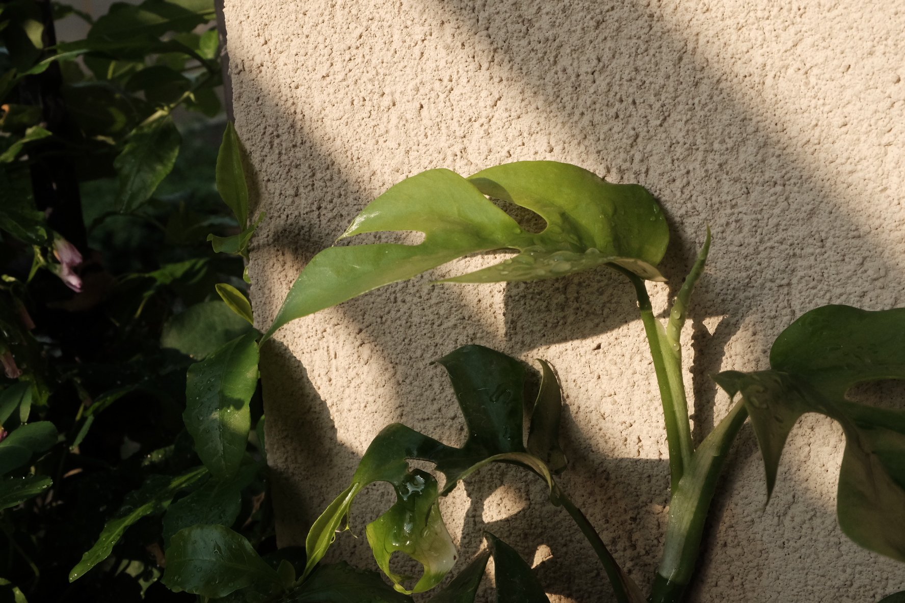 姬龟背,也叫“飞来凤”。可能是地域气候的问题,我看广州的朋友养出来,每片叶子间隔都好长,有一种疏离飘逸之美,我这株略显“矮壮”。而且因为我搬得比较频繁,随之而来的叶片受损问题也比较严重,其实还是没能养出它的状态来。这个能照到点太阳、又有点其他植物荫头的位置算是比较适合它的,既有一点围墙可以依倚,又不至于被烈日炽烤。