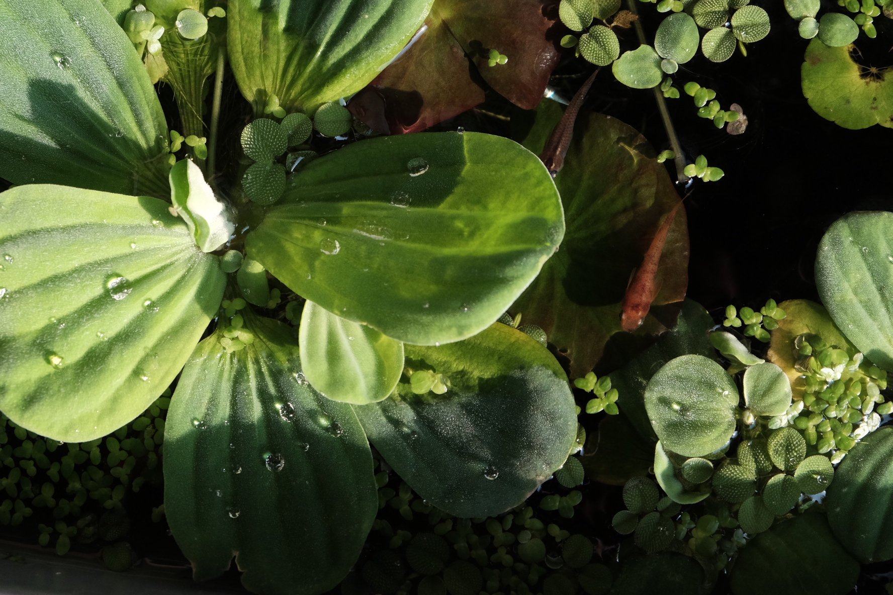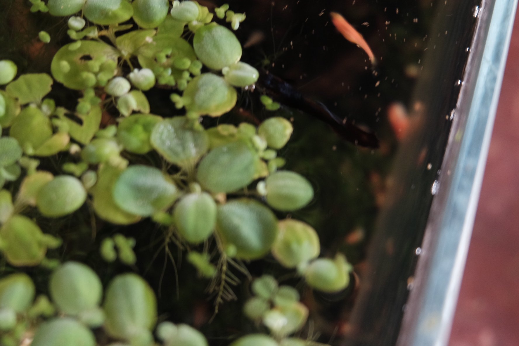 水芙蓉、槐叶萍、芝麻萍、睡莲、青鳉鱼,一口用转运箱做的生态缸,里面放了火山石的底砂,有螺、有虾,稳定运行快三年了。