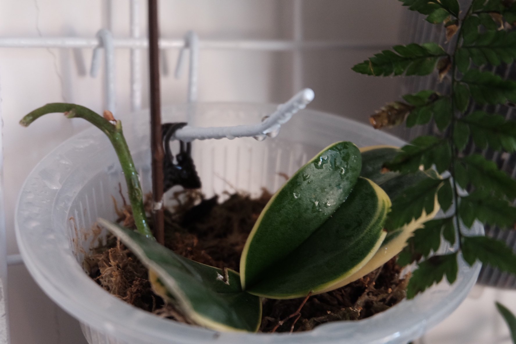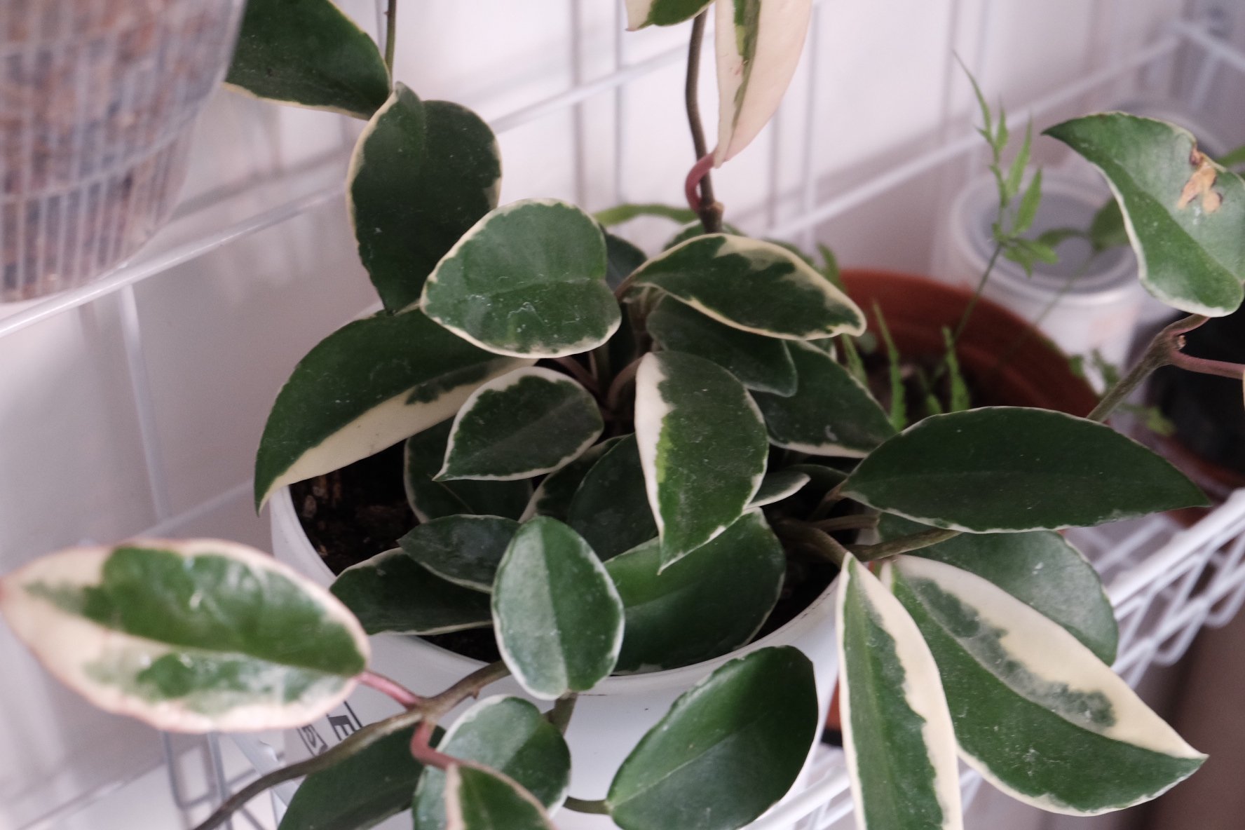 花叶球兰,也是一种龟速生长的植物。不知道如何才能让它加快点速度。有时候甚至会觉得它蜡质层过厚的叶子像是假花一样,常常是毫无动静的状态。都说它要三四年才会开花,要种在相对比较小的盆子里,让它感觉到生存环境局促才会开花。我还有另外两根球兰苗,是普通叶片的球兰,同样也是毫无波澜的状态,扔在土里好几个月了,也不知道它生根了没有,反正叶片还是绿的,也不敢轻易翻出来看。