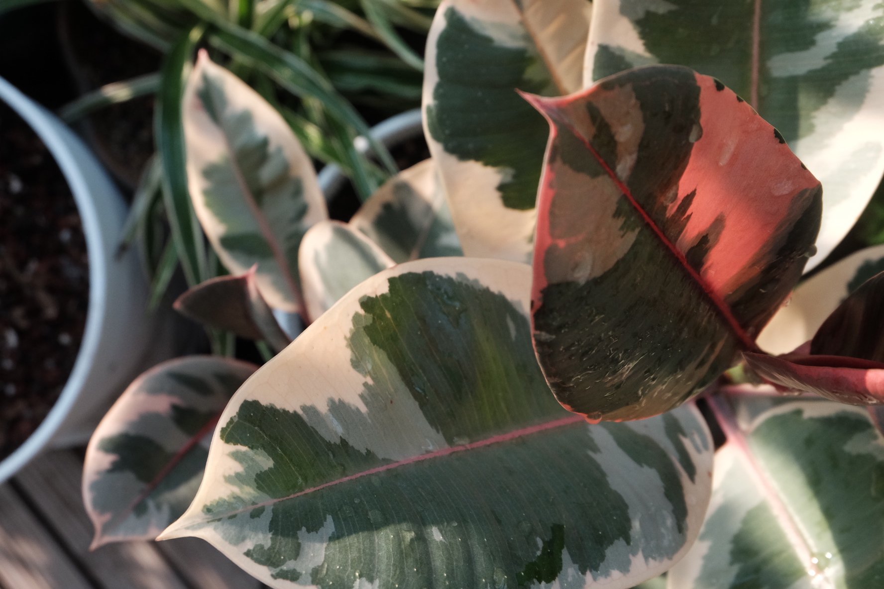 花叶橡皮树,这棵的商品名应该是叫“红关公”。初生的叶子偏红,尔后就是不规则的锦斑。我这几年养了不少出锦的植物,它们无一例外对于光照的要求都比较特殊,光照强弱、时长都会影响它们出锦的效果,每一盆都需要慢慢摸透它们的脾气,也需要随着季节的变化,不断地调整它们的摆放位置。