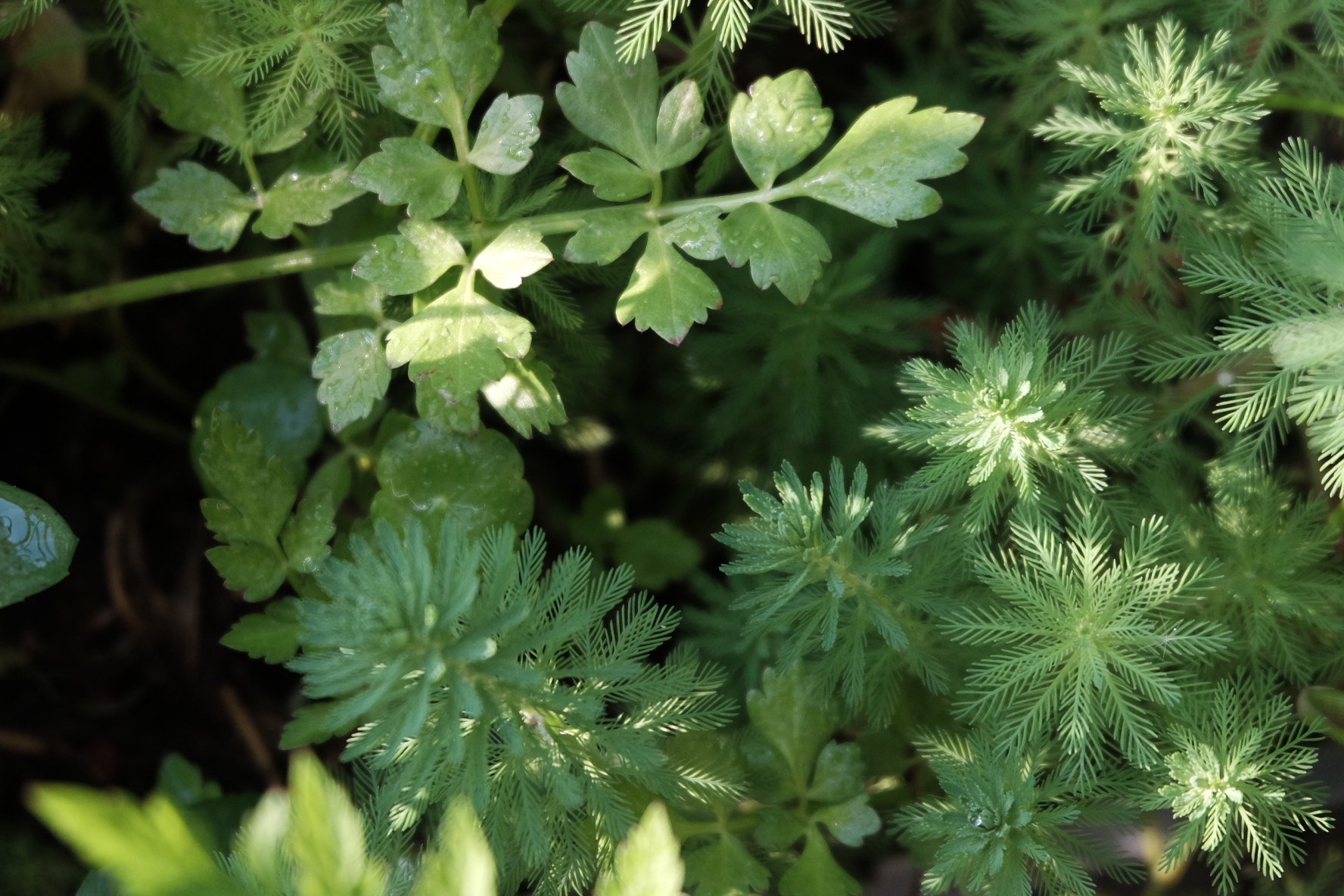 像小松一样的叫狐尾草、另一边是水芹,也就是我们在菜市能够买到、能够上得了餐桌的水芹。这两种植物,我都是用在水缸里面的,它们对光照需求强烈,室内养殖,即便是上了水草灯也会发黄、枯萎。