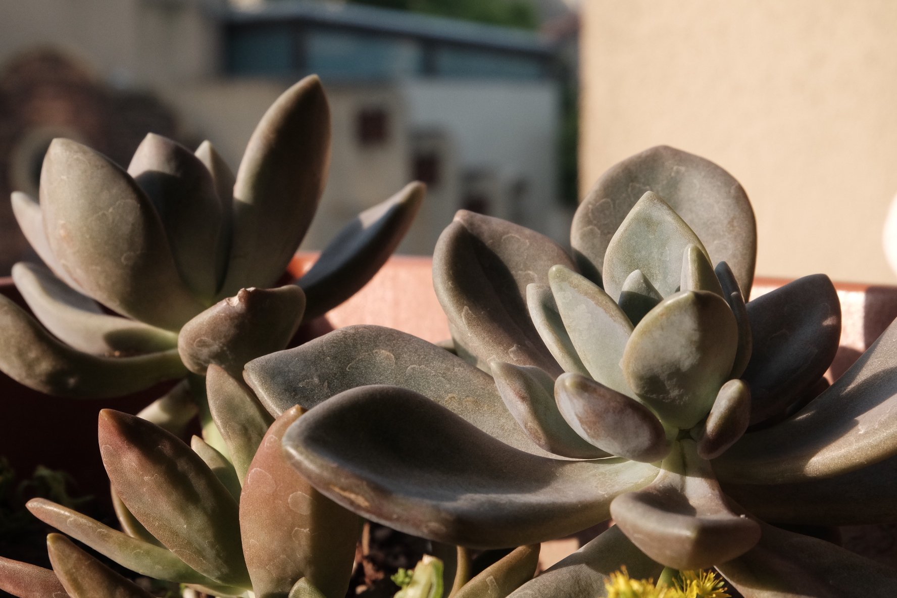 皮氏石莲,按理是要灌根式浇水,多肉的叶瓣上才不会出现水渍,才不会影响它的美观。但是我觉得,这种极为自然的状态,也挺好的。用喷壶浇水,我也方便许多,毕竟有那么多植物,早上时间又那么紧,往往会照顾不过来。
