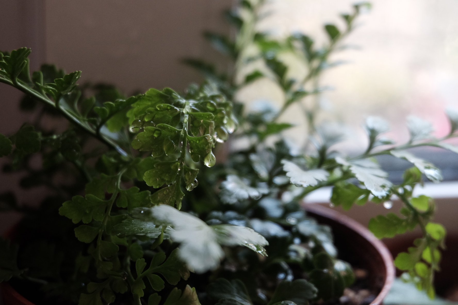 某种蕨类,之前记得它叫什么名字来着的,现在这会儿怎么也想不起来。比起狼尾蕨,它比较好伺候一些。它是我在大卖场甩货的时候买的。大卖场的园艺区,往往就有这种特别有意思的植物,而能够撑到“大甩卖”的,多半都是耐“操”型的,不需要怎么照拂,不需要怎么费心的那种。