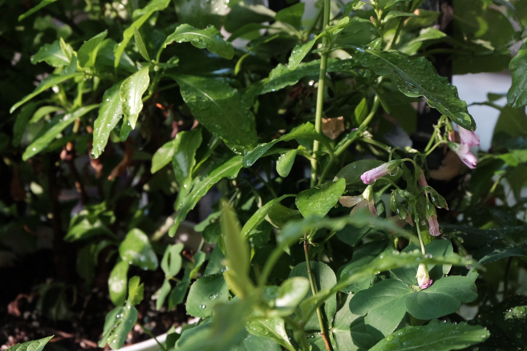 红花三叶草和蓝雪花,本来也不是种在同一个盆里的,不知道为什么就冒出来许多红花三叶草。也不忍心给它拔了,于是它们就是这样的伴生关系。红花三叶草植株不高,蓝雪花一直在抽条,彼此也不太影响。这样的种植模式,我也用在了天堂鸟和仙洞龟背竹上,高大植物下面,沿着盆沿口长着一丛,视觉上有错落感,高大植物也帮着下面的耐荫的植物挡掉一些阳光,挺有原生态感觉的一种安排。