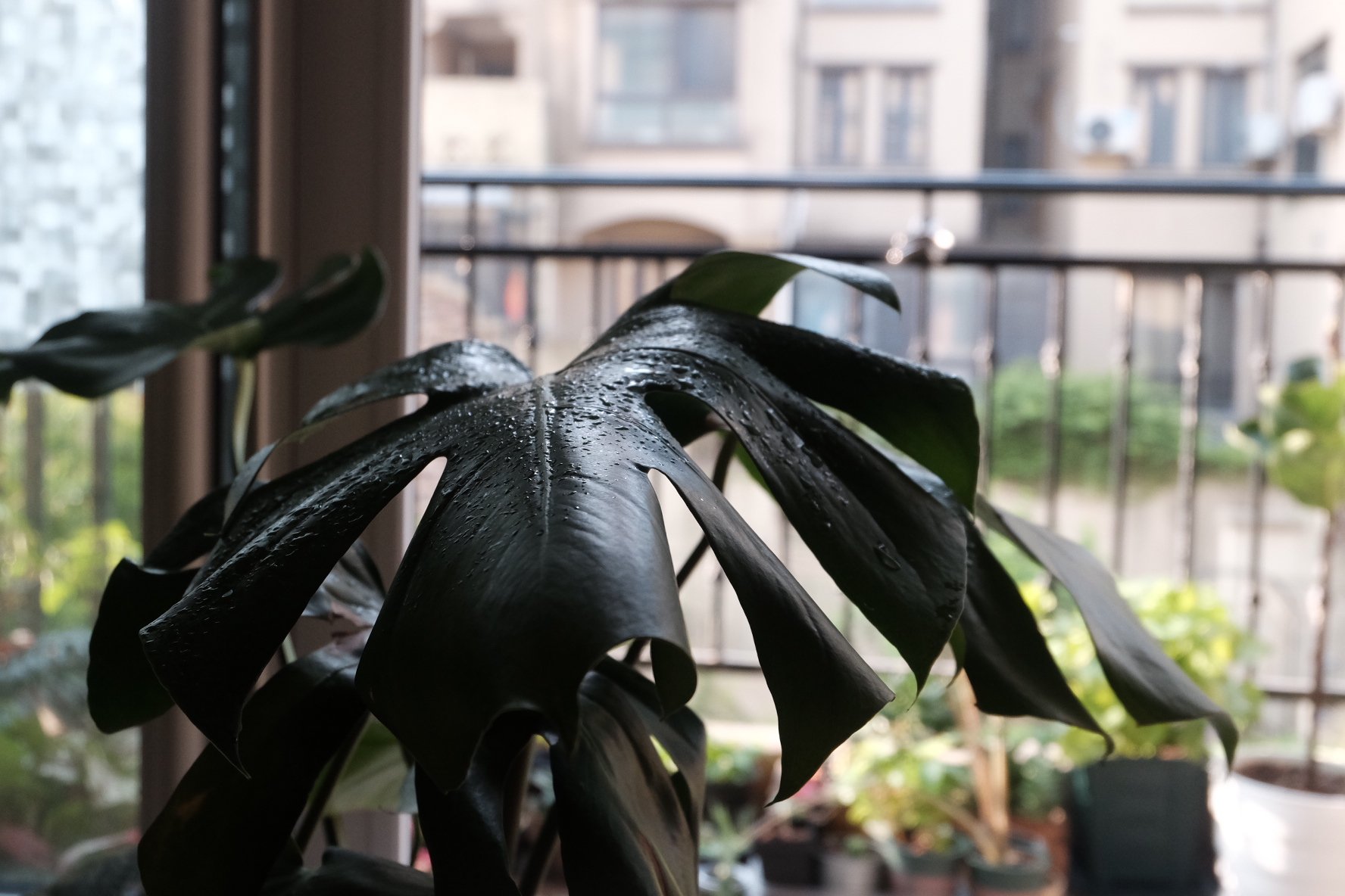 龟背竹类的,比较适合半荫的状态。这盆大的龟背竹,太阳初升的时候,我会放它在阳台上沐浴一下晨光,等到日上三竿的时候,我会再将它移进来。盆太重,不太容易搬,就去买带滑轮的花盆托。每天像牵着一条狗一样,将它移到东,移到西地遛一圈。龟背竹养出状态来,是真好看,尤其是“老龟”,叶脉中缝处也有开背的洞洞。