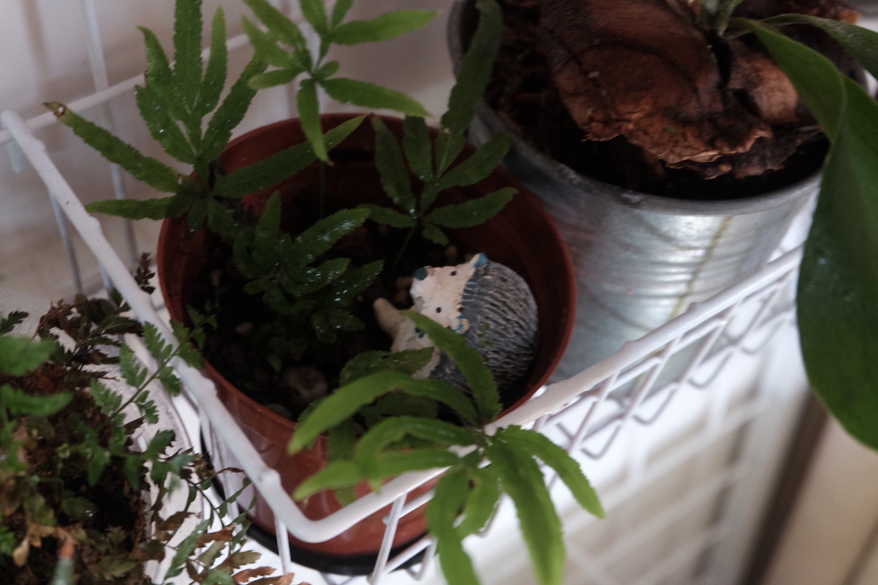 凤尾蕨,有个俗名叫“井栏草”,基本上是长在井栏和沟渠内壁上的植物。北面的院子,被邻近的四道墙围着,更接近天井的结构,所以它便在花盆里野生入驻。年年会采一点来移植在小盆里面,年年也撑不过几个月便枯掉。单纯地喜欢它亭亭玉立的风姿,却又没有办法在人工的条件下拥有,这其中一直有一个无法解开的死结。野生条件下无人问津,蓬勃的一大丛。人工条件下,天天关照,反倒是越长越抽巴,抽着抽着就没有了。