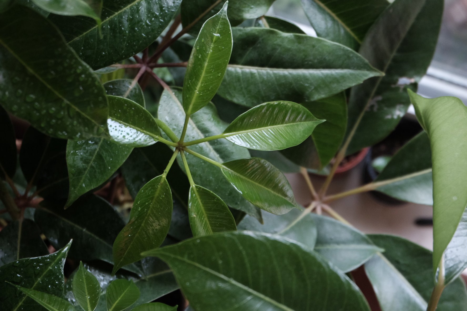 这盆“澳洲鸭掌柴”,很长一段时间都被我当作“日本大叶伞”来养。也不能怪我,卖家便是以“日本大叶伞”的名头卖给我的。最终让我觉出它不是“日本大叶伞”的关键要素,是这盆植物过于壮硕丰满,始终没有“日本大叶伞”的疏离感。这植物也有它的奇特之处,每柄新生的叶片数量都不太固定,年幼的时候三五片,进入旺盛的生长期,一柄居然有九片之多。不过,它还是比较容易受蓟马、切叶蜂等虫害,叶片会变得卷曲、皱巴或破损。