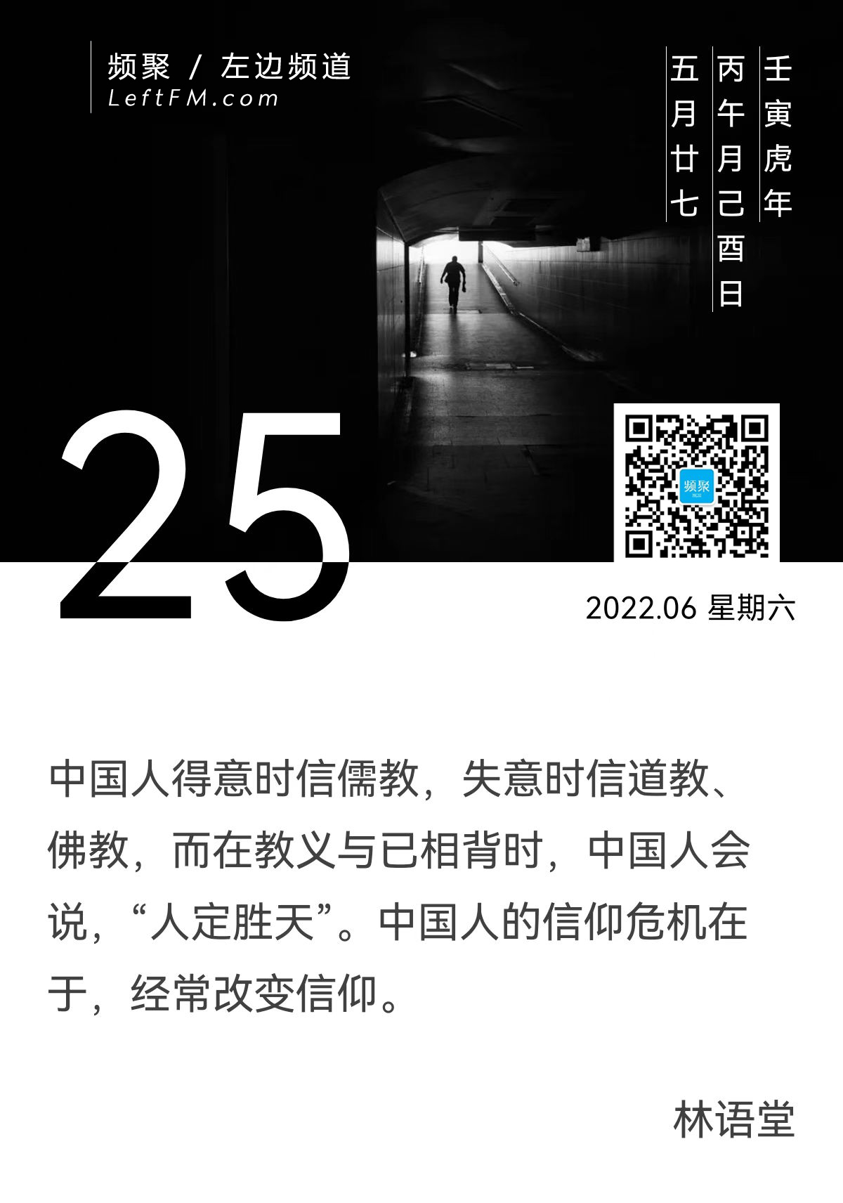 中国人得意时信儒教,失意时信道教、佛教,而在教义与已相背时,中国人会说,“人定胜天”。中国人的信仰危机在于,经常改变信仰。
