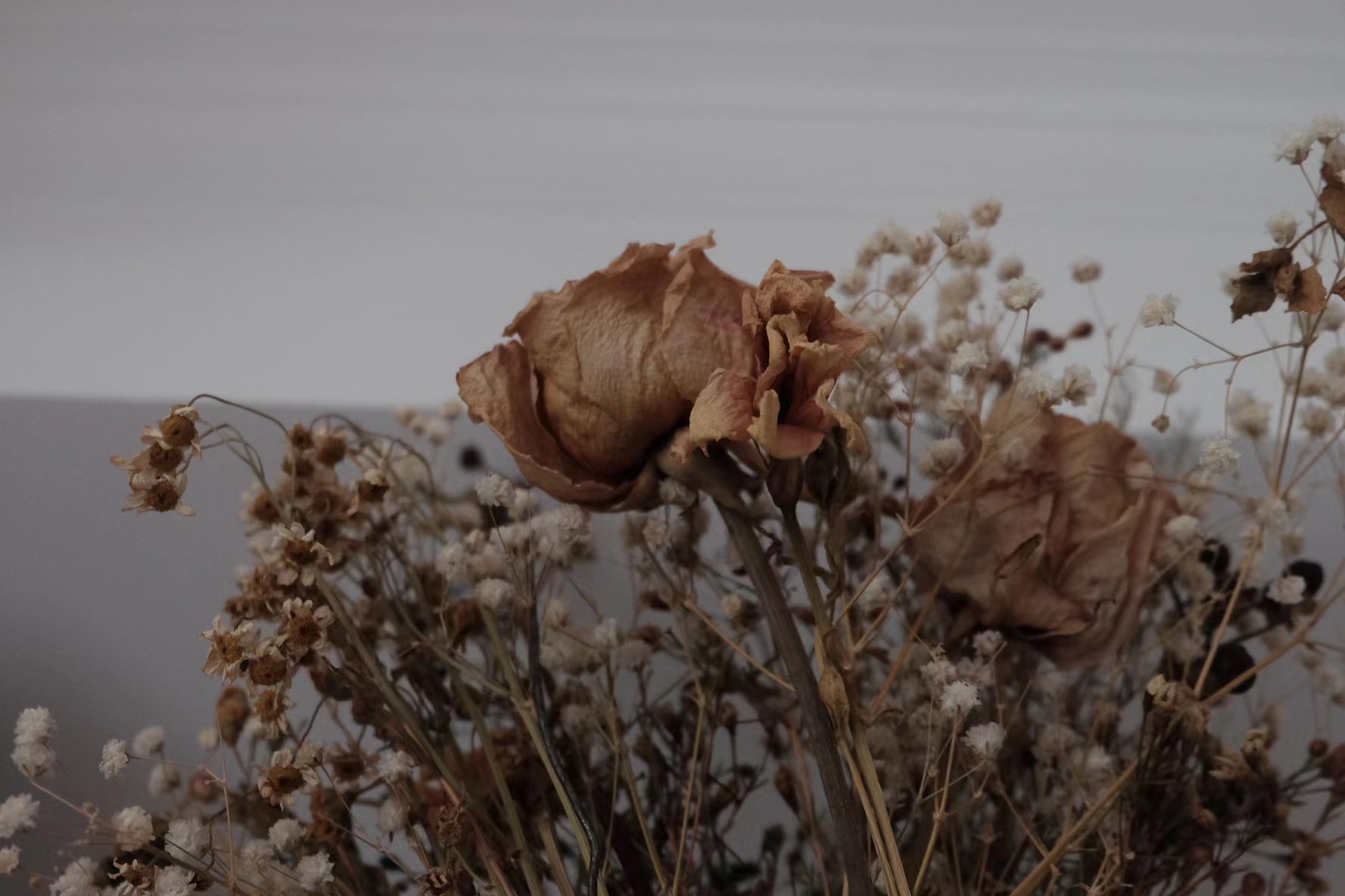 装在镜匣中的干花,是别人的手工,经过了做了干燥、漂白、着色等诸多工序,加之又封闭在一个相对稳定的环境里,所以能够保持得住一些。颓败的美感,不是每个年纪都能欣赏得来的一种状态,反倒是需要有一些人生的经历,看惯了红红绿绿曾经鲜活的样子,知道生命的无常与轮回,坦然接受逐渐归于平寂的穷途末路,才能慢慢懂窥见那些藏得很深的美感。