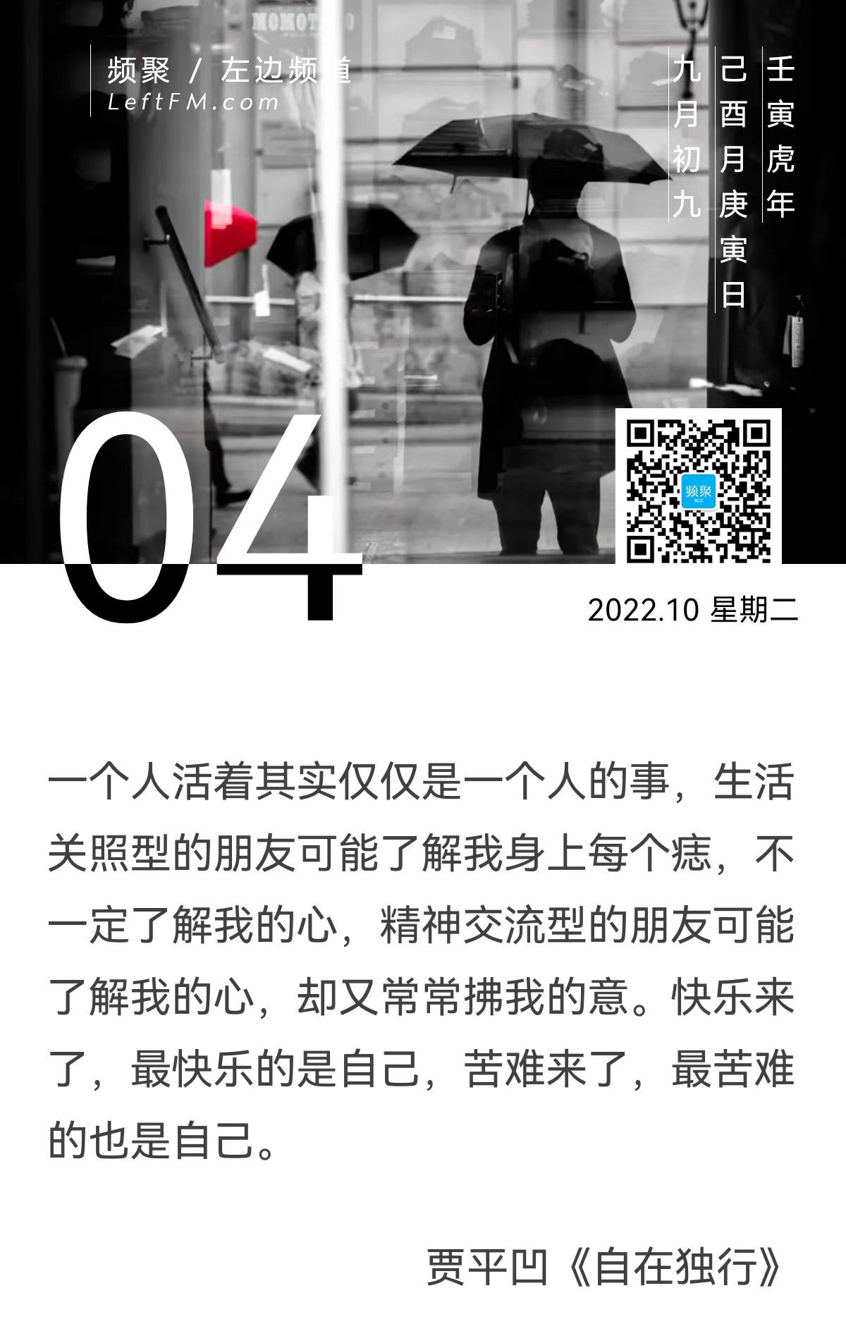 一个人活着其实仅仅是一个人的事,生活关照型的朋友可能了解我身上每个痣,不一定了解我的心,精神交流型的朋友可能了解我的心,却又常常拂我的意。快乐来了,最快乐的是自己,苦难来了,最苦难的也是自己。