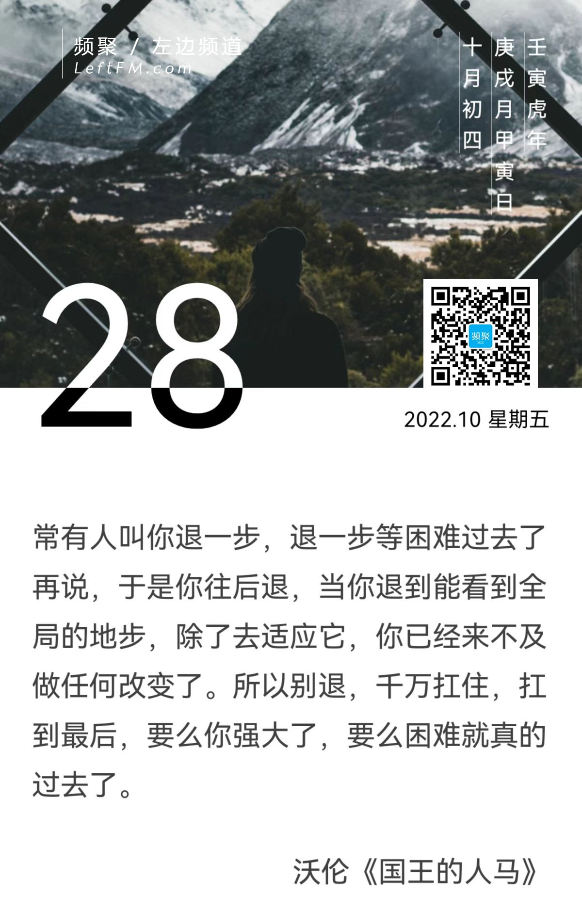 常有人叫你退一步,退一步等困难过去了再说,于是你往后退,当你退到能看到全局的地步,除了去适应它,你已经来不及做任何改变了。所以别退,千万扛住,扛到最后,要么你强大了,要么困难就真的过去了。