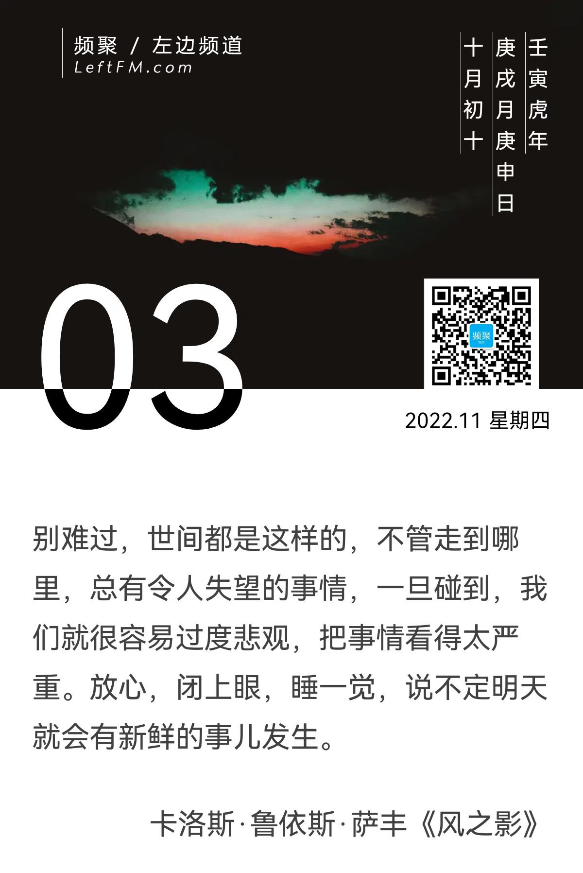 别难过,世间都是这样的,不管走到哪里,总有令人失望的事情,一旦碰到,我们就很容易过度悲观,把事情看得太严重。放心,闭上眼,睡一觉,说不定明天就会有新鲜的事儿发生。