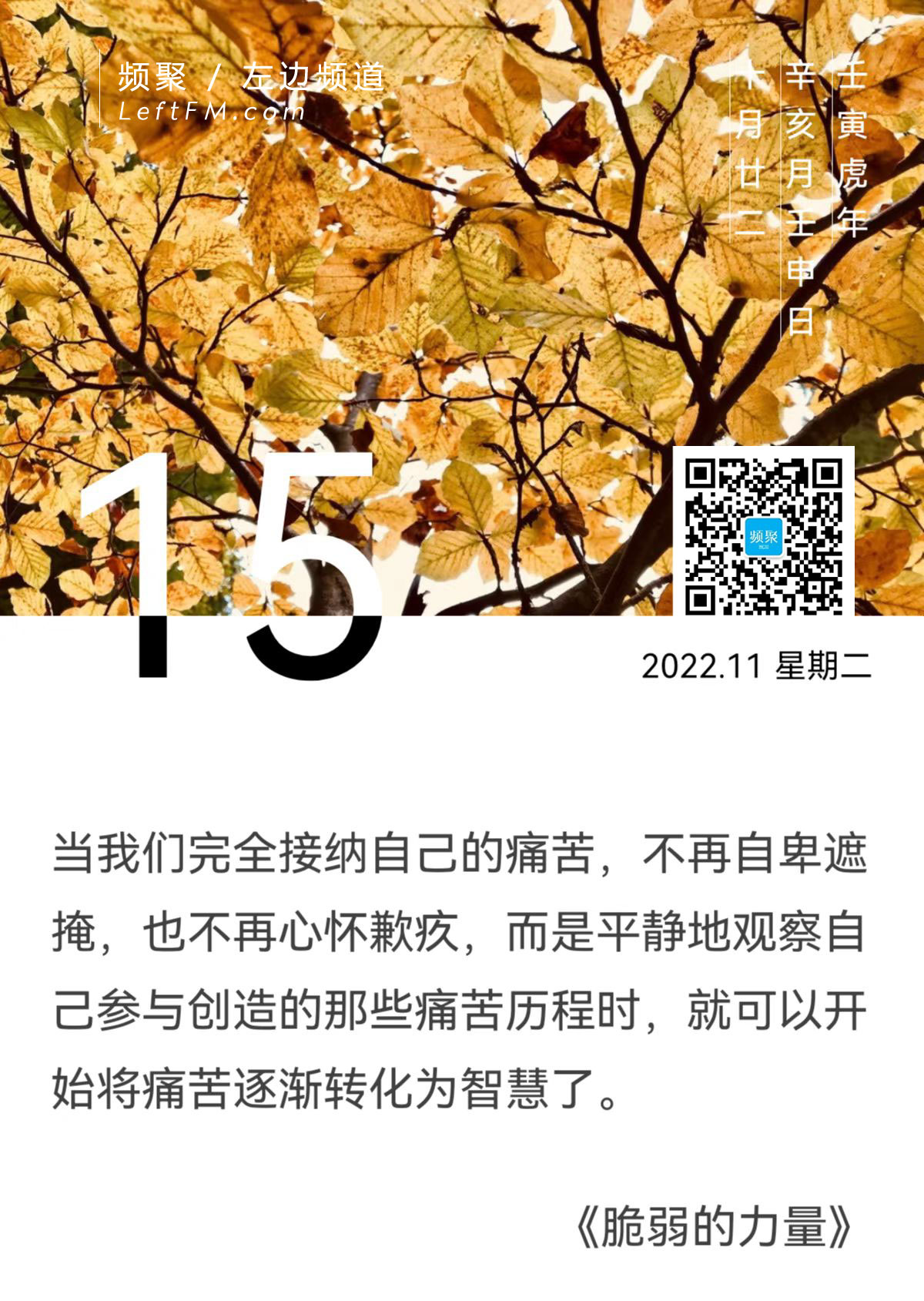 当我们完全接纳自己的痛苦,不再自卑遮掩,也不再心怀歉疚,而是平静地观察自己参与创造的那些痛苦历程时,就可以开始将痛苦逐渐转化为智慧了。