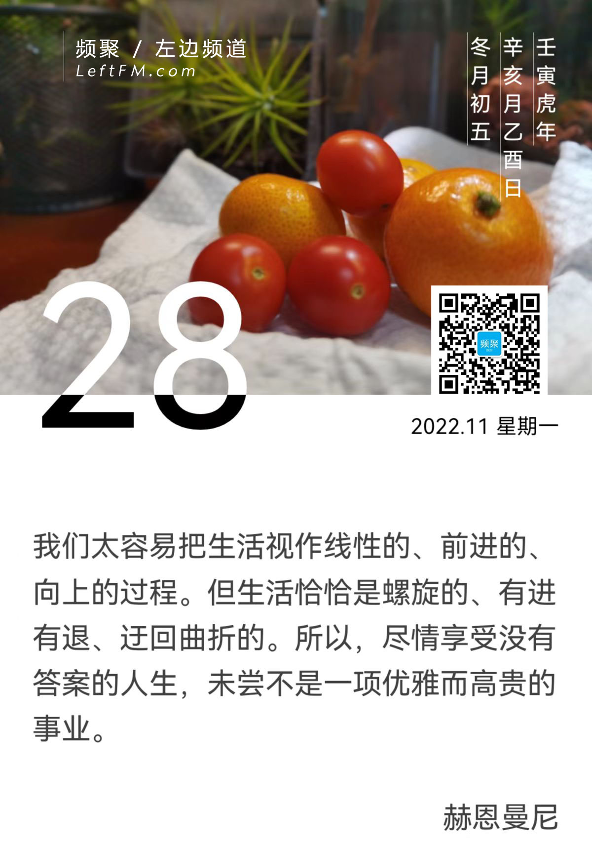 我们太容易把生活视作线性的、前进的、向上的过程。但生活恰恰是螺旋的、有进有退、迂回曲折的。所以,尽情享受没有答案的人生,未尝不是一项优雅而高贵的事业。