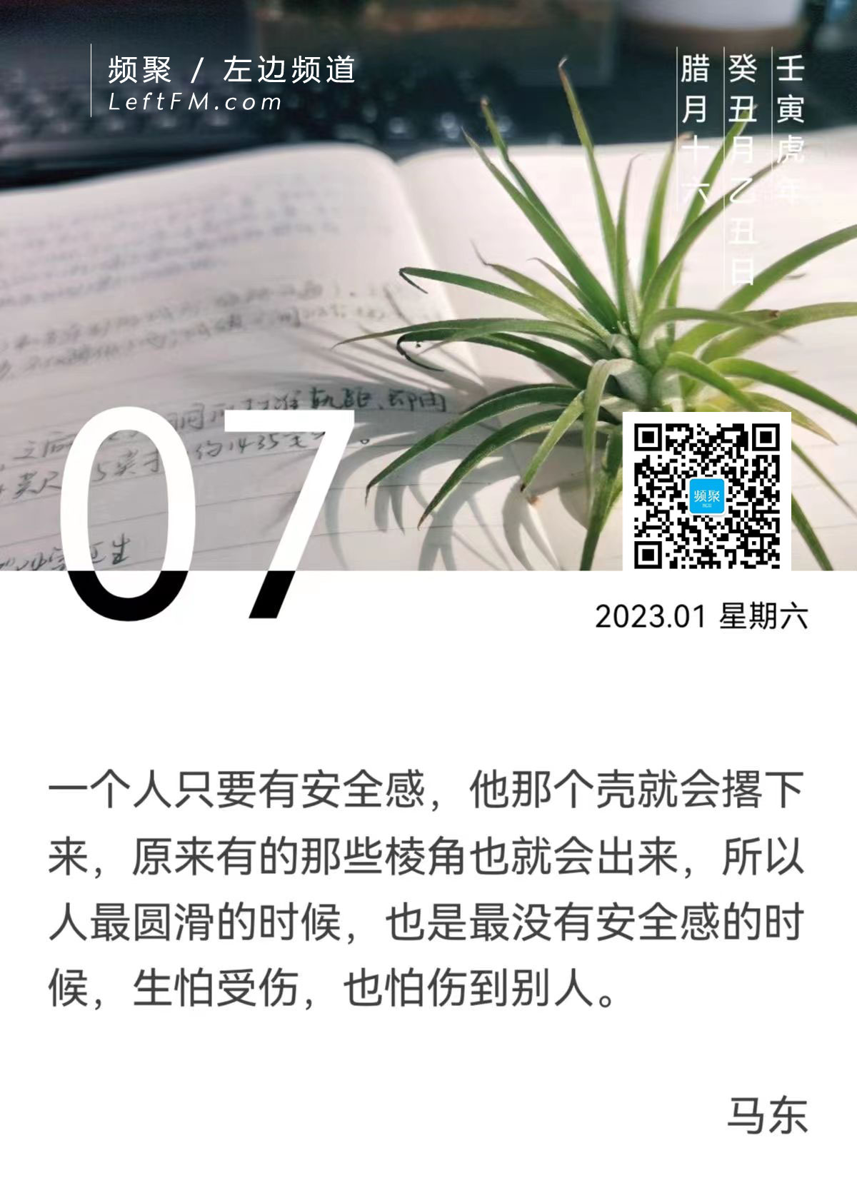 一个人只要有安全感,他那个壳就会撂下来,原来有的那些棱角也就会出来,所以人最圆滑的时候,也是最没有安全感的时候,生怕受伤,也怕伤到别人。